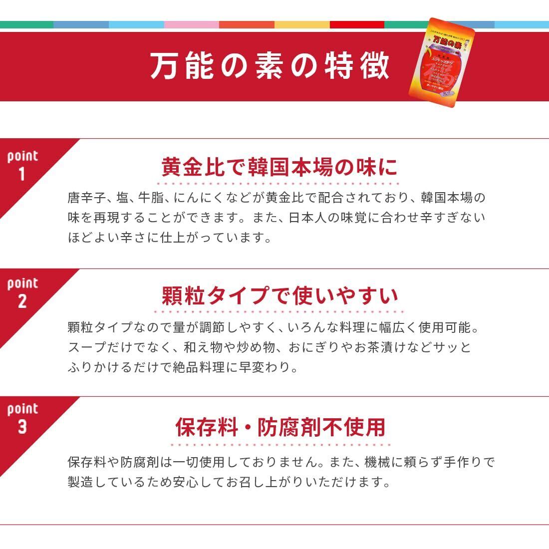 ・万能の素一袋で、スープ系も炒め物も簡単に本格的な味に仕上がるから、まさに「万能」! 毎日の食卓に韓国の味を手軽にプラスできちゃいますよ。