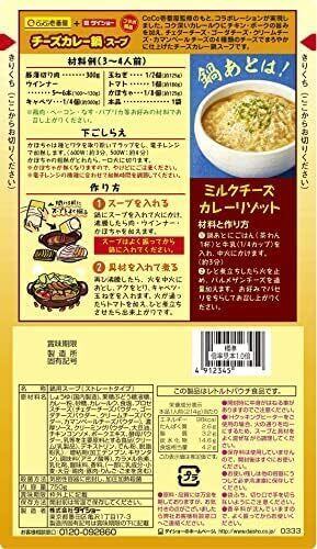 CoCo壱番屋監修のもと、コラボレーションが実現しました。コク深いカレールウにチキン・ポークの旨みを加え、チェダーチーズ・ゴーダチーズ・クリームチーズカマンベールチーズの4種類のチーズでまろやかに仕上げたチーズカレー鍋スープです。※鶏肉・ベーコン・なす・パプリカ等お好みの材料でお召し上がりください。鍋あとは 【ミルクチーズカレーリゾット】