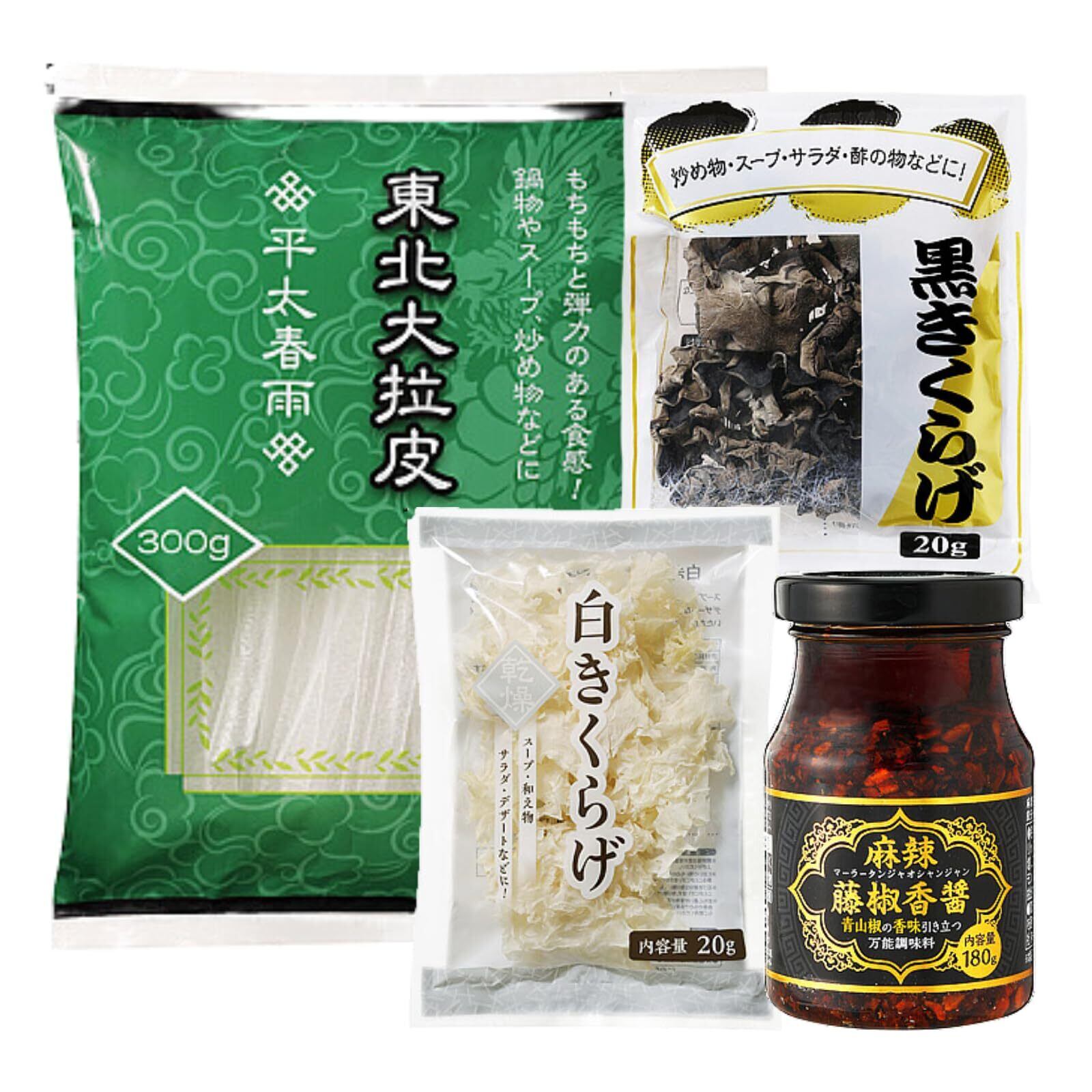 内容量:麻辣藤椒香醤 ( マーラータン ジャオシャンジャン ) 180g + 東北大拉皮 ( 平太春雨 ) 300g + 白きくらげ (乾燥) + 黒きくらげ (乾燥) 20g