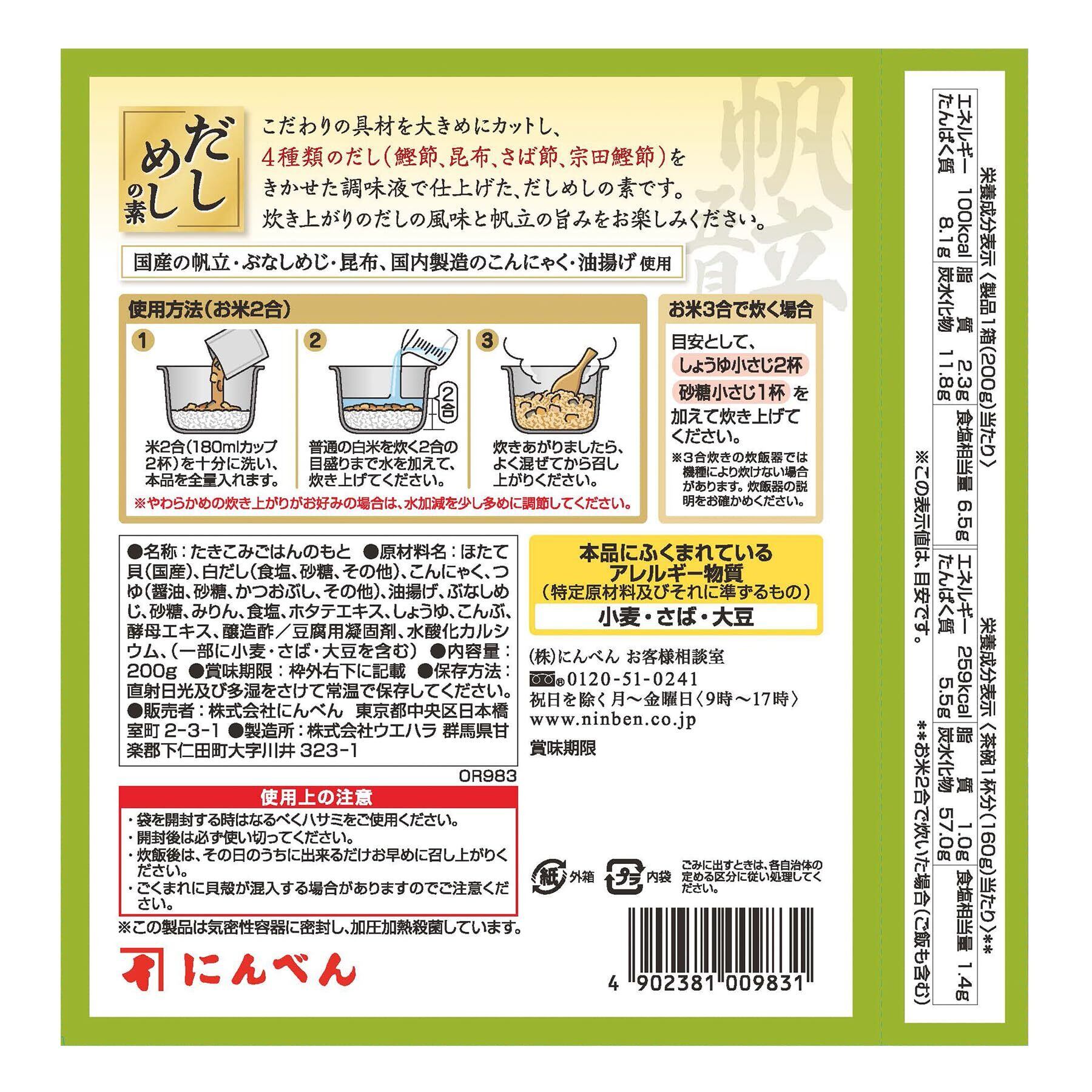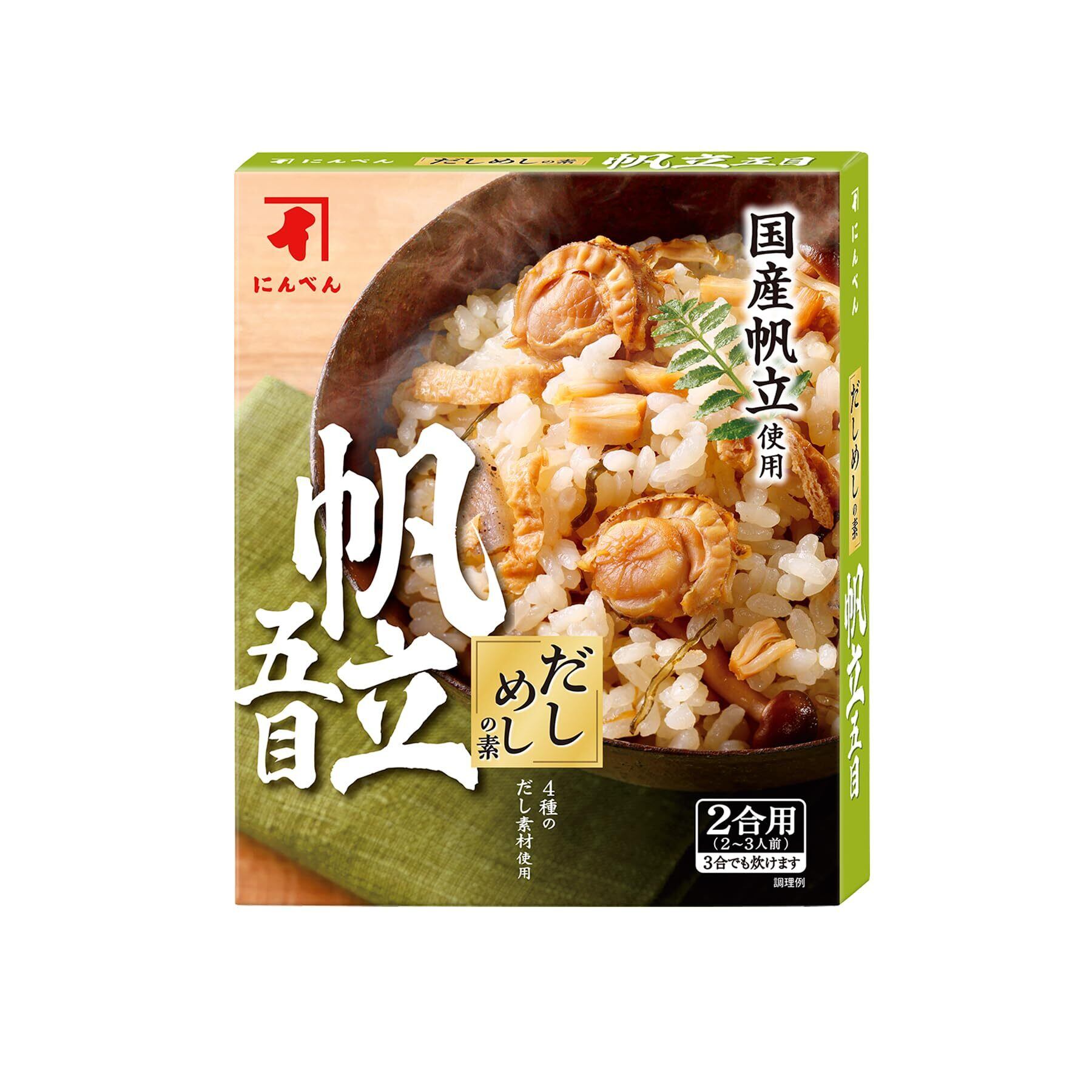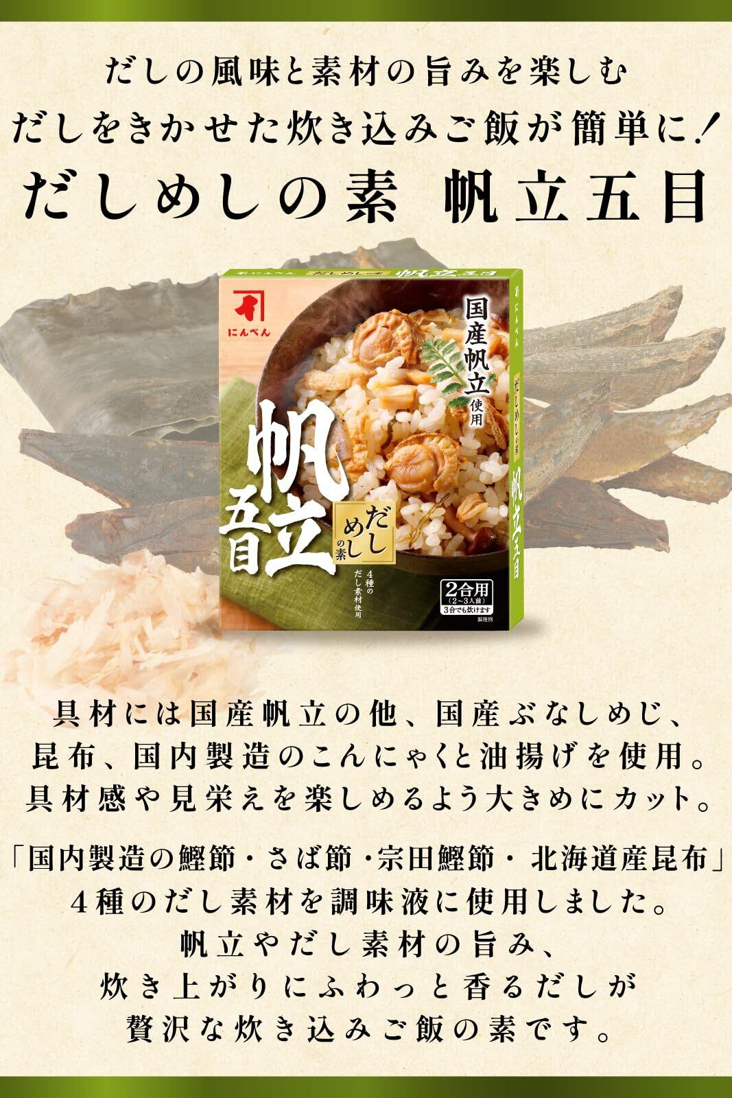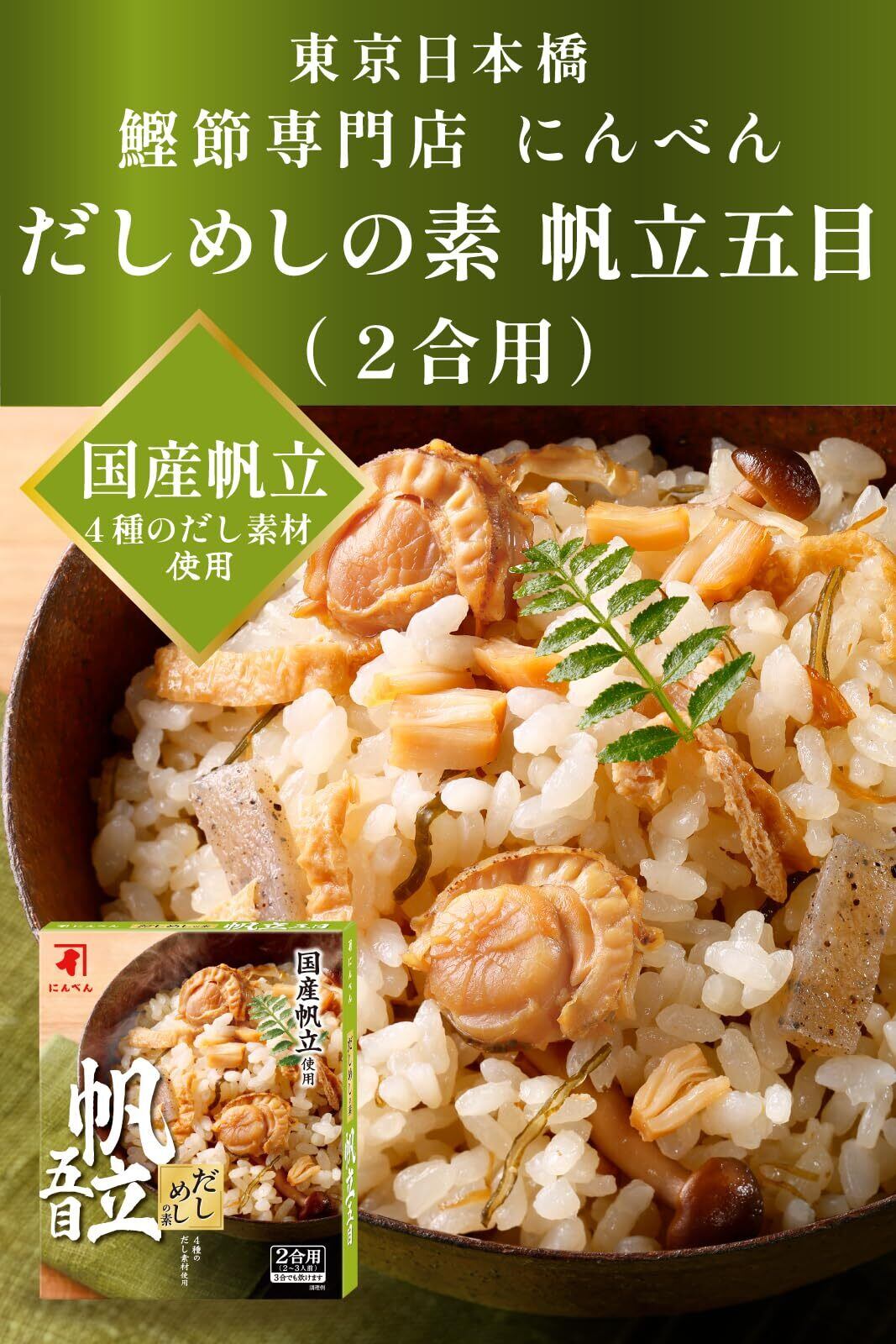 にんべん だしめしの素 帆立五目 (海鮮五目 炊き込みご飯の素 釜めし 具入り 2合用 国産帆立 かつお節 さば節 宗田鰹節 昆布) 1699年創業 鰹節・だし専門店のにんべん 200g