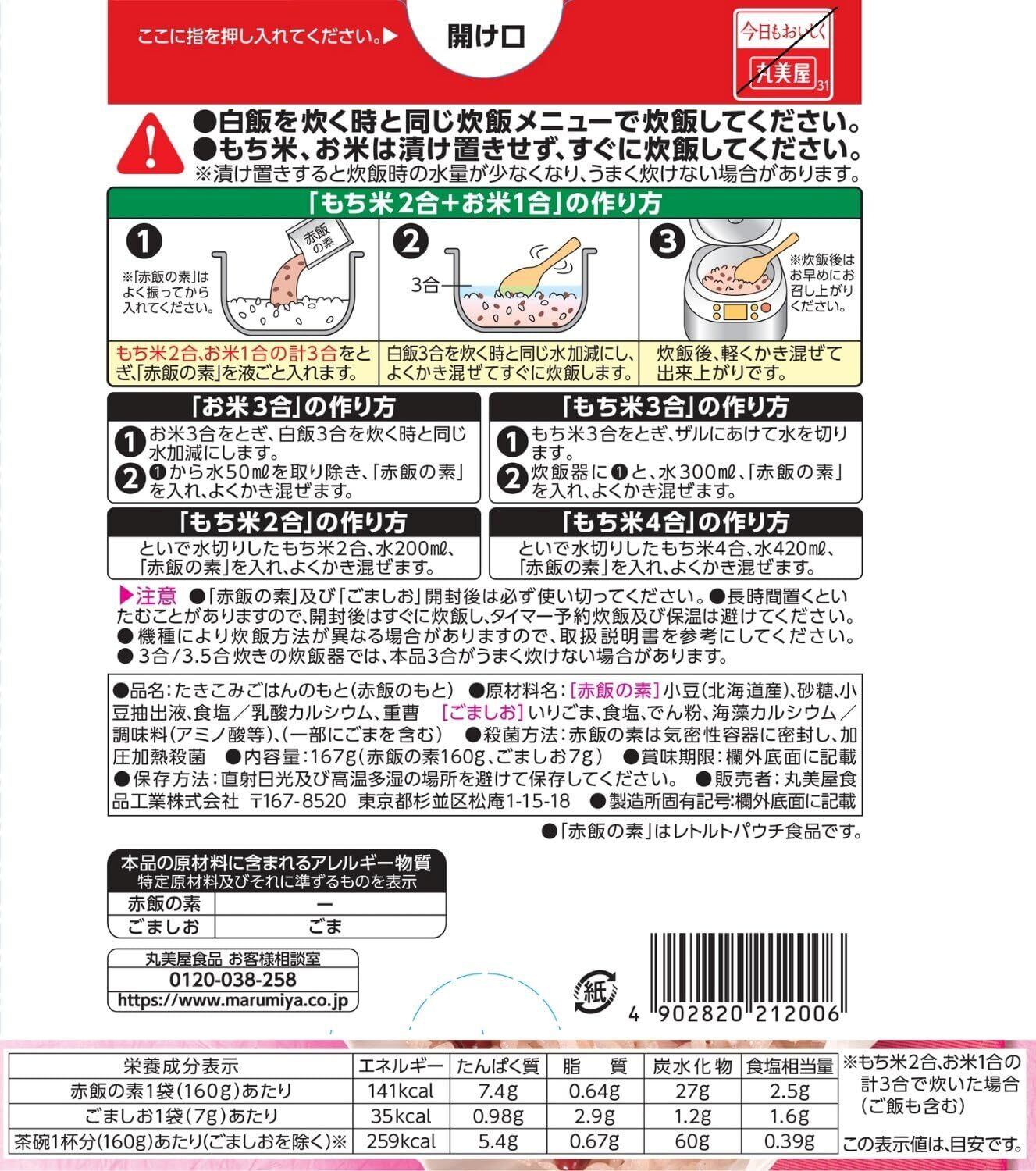 [赤飯の素]小豆(北海道産)、砂糖、小豆抽出液、食塩/乳酸カルシウム、重曹|[ごましお]いりごま、食塩、でん粉、海藻カルシウム/調味料(アミノ酸等)、(一部にごまを含む)