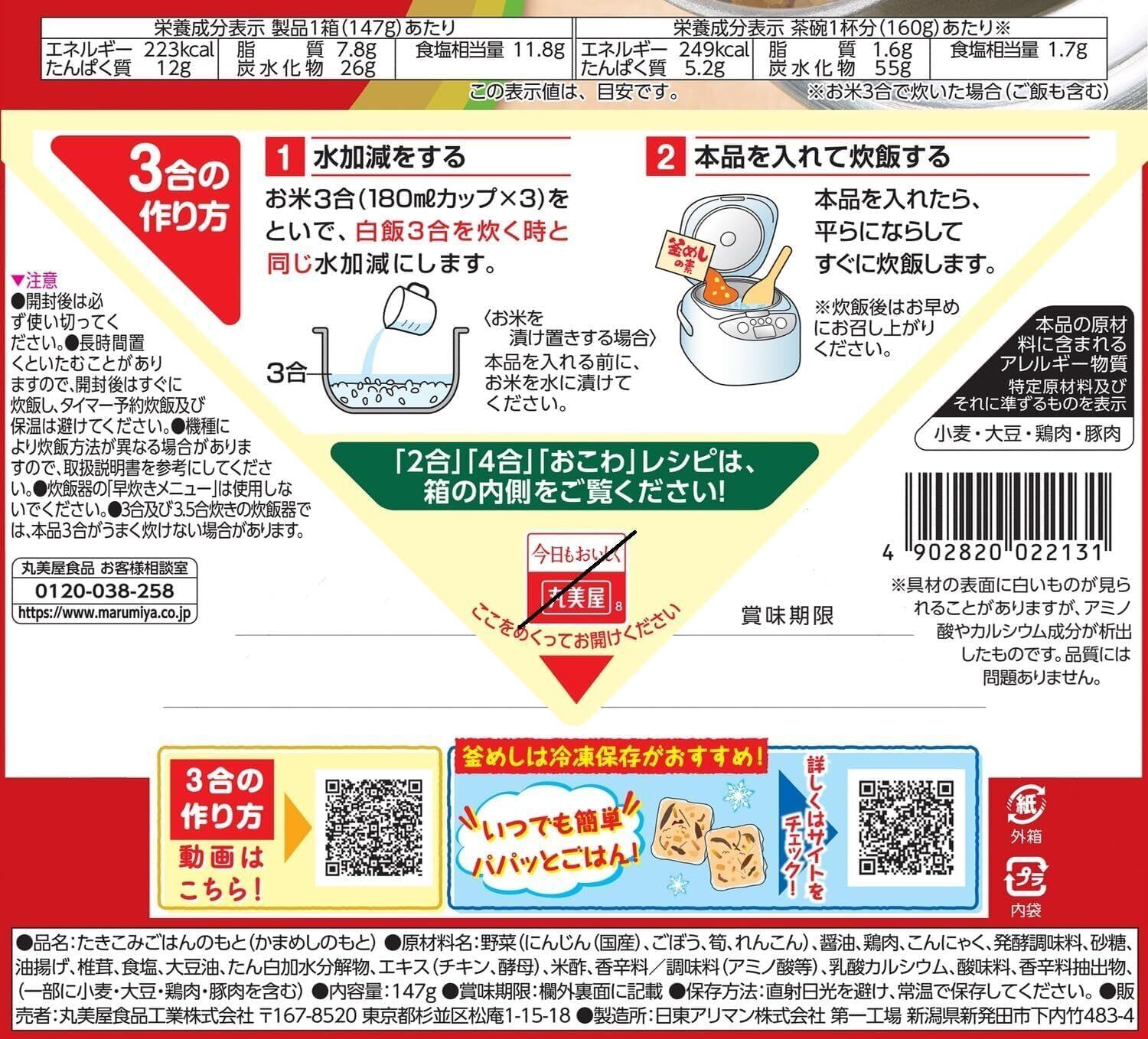 8種の具材(にんじん・ごぼう・筍・れんこん・鶏肉・こんにゃく・油揚げ・椎茸)が入ったボリュームたっぷりの釜めしの素です。