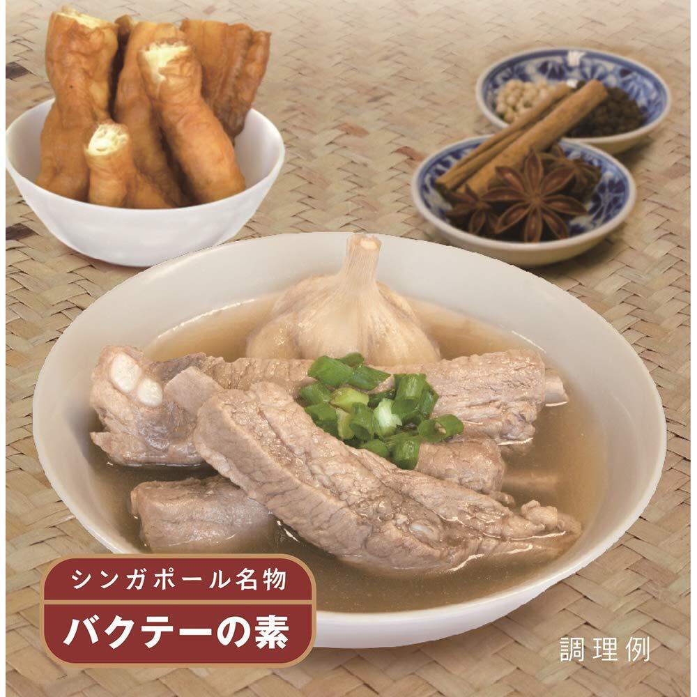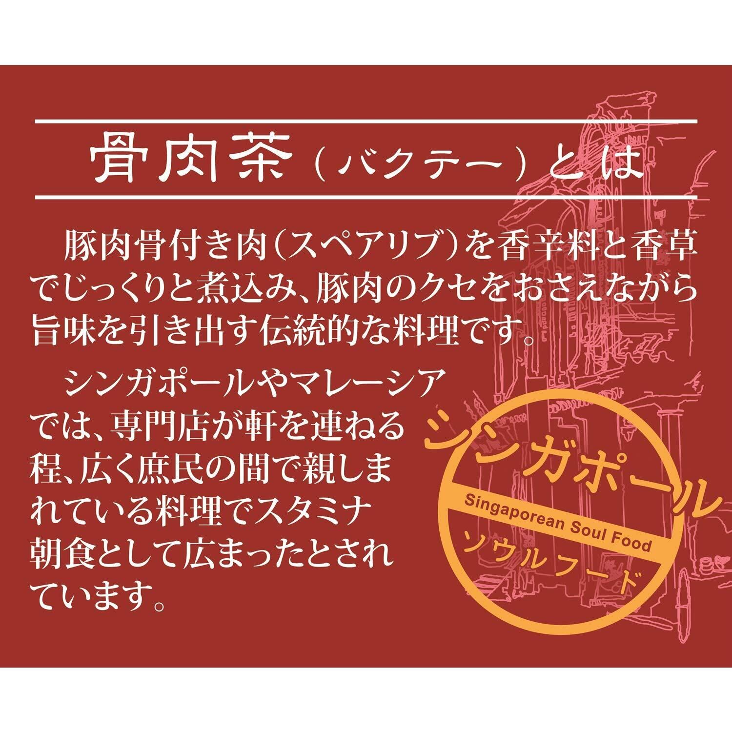 シンガポールでおなじみのB級グルメ「肉骨茶(バクテー)」。豚骨付き肉(スペアリブ)を香辛料と香草でじっくりと煮込み、豚肉のクセをおさえながら旨味を引き出した伝統的な料理です。本品は胡椒を効かせたシンガポール式の白バクテーで、胡椒、にんにく、スペアリブの旨味が出たスープはクセになります。