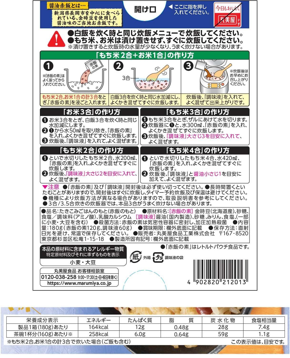 原材料:[赤飯の素]金時豆(北海道産)、砂糖、食塩/調味料(アミノ酸)、乳酸カルシウム|[調味液]醤油(国内製造)、砂糖、みりん、食塩、(一部に小麦・大豆を含む)