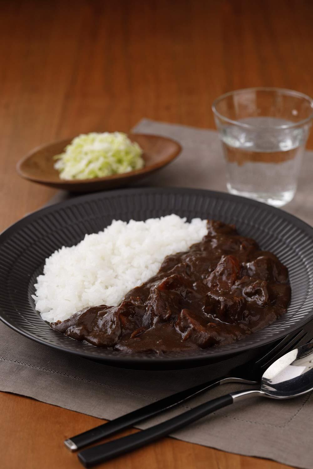 【あえて液体原料を使用】液体原料を多く使用すると、水分を蒸発させるための加熱時間がかかり通常のカレールウでは粉末原料を使用することがほとんど。しかし、液体原料を使用し時間をかけて煮詰めた方が、独特の味・香りが全体に行き渡りおいしさが増します。そのため「横濱舶来亭」では、あえて手間と時間のかかる液体原料を多く使用しています。