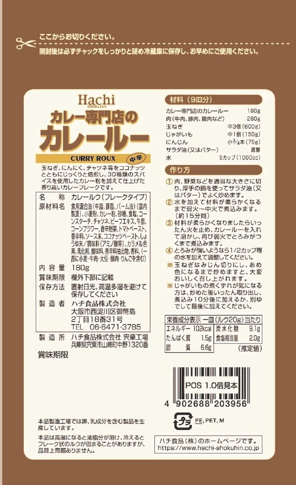 原材料:食用油脂(牛脂、豚脂)、小麦粉、カレー粉、食塩、砂糖、コーンスターチ、チャツネ、野菜(にんにく、トマト)、ビーフエキス、香辛料、オニオン末、ココナッツペースト、ソース末、しょうゆ末、ココア末、調味料(アミノ酸等)、カラメル色素、乳化剤、酸味料、香辛料抽出物、香料