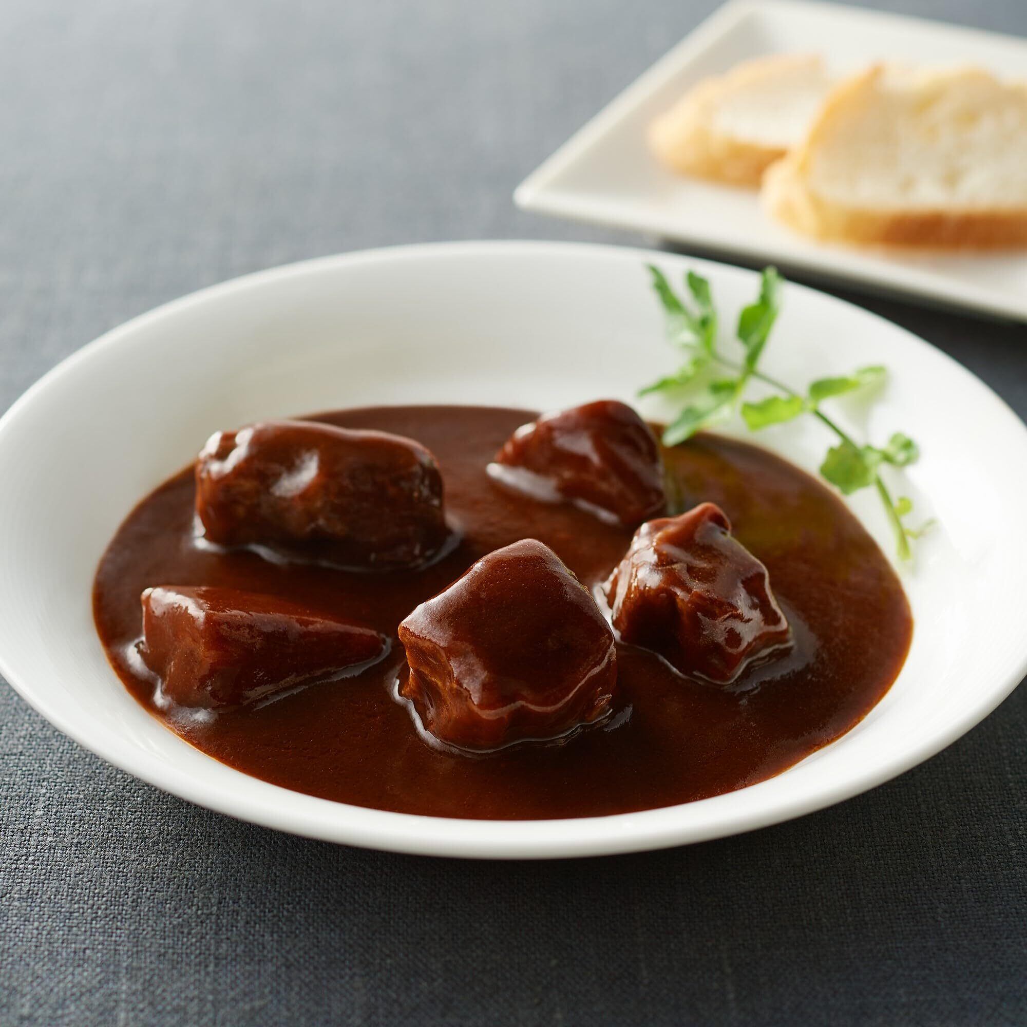 ごろっとした牛肉を、香味野菜と赤ワインを加えたデミグラスソースで煮込みました。レンジでそのまま温めるだけの洋惣菜です。