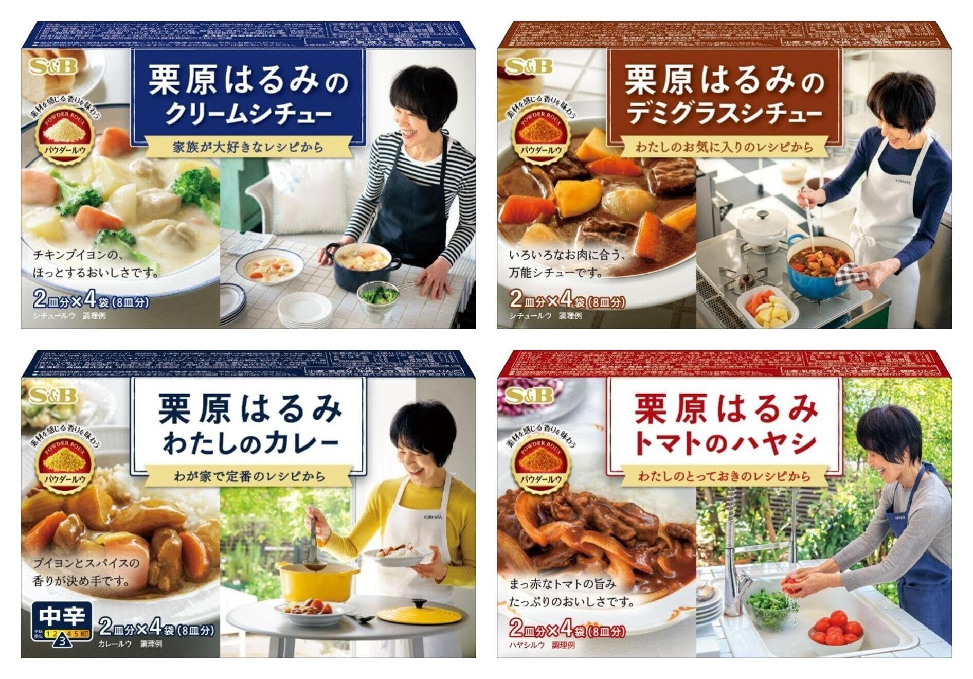 栗原はるみ わたしのカレー 中辛110g(27.5g×4袋):料理家・栗原はるみが家庭で作り続けるこだわりのカレーを再現。丁寧に炒めた玉ねぎの甘みと、チキンとビーフの特製ブイヨンのコクを活かし、スパイスの香りを効かせた特製のカレーです。 栗原はるみのクリームシチュー102g(25.5g×4袋):料理家・栗原はるみが家庭で作り続けるクリームシチューを再現。特製のチキンブイヨンと丁寧に仕立てたホワイトソースを合わせた、素材のおいしさがたっぷり味わえるクリームシチューです。 栗原はるみのデミグラスシチュー110g(27.5g×4袋):料理家・栗原はるみが家庭で作り続けるデミグラスシチューを再現。コク深いビーフブイヨンが決め手の特製デミグラスソースが、牛・豚・鶏など様々なお肉に合うシチューです。 栗原はるみ トマトのハヤシ96g(24g×4袋):料理家・栗原はるみが家庭で作り続けるハヤシライスソースを再現。トマト素材をふんだんに使用し、ブイヨンやバター、赤ワイン等を加えて丁寧に仕立てた、旨みたっぷりのハヤシライスソースです。