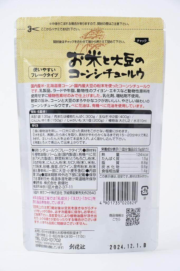 創健社 お米と大豆のコーンシチュールウ 135gは、【6皿分】 1.鍋に植物油を熱し、一口大に切った肉や野菜をこがさない程度に炒めます。 2.水(810ml)を加え、沸騰したらあくを取り、材料がやわらかくなるまで約15~20分中火で煮込みます。 3.いったん火を止めて本品を入れ、よく溶かし込んでください。 4.再度とろ火で煮込んで出来上がりです。