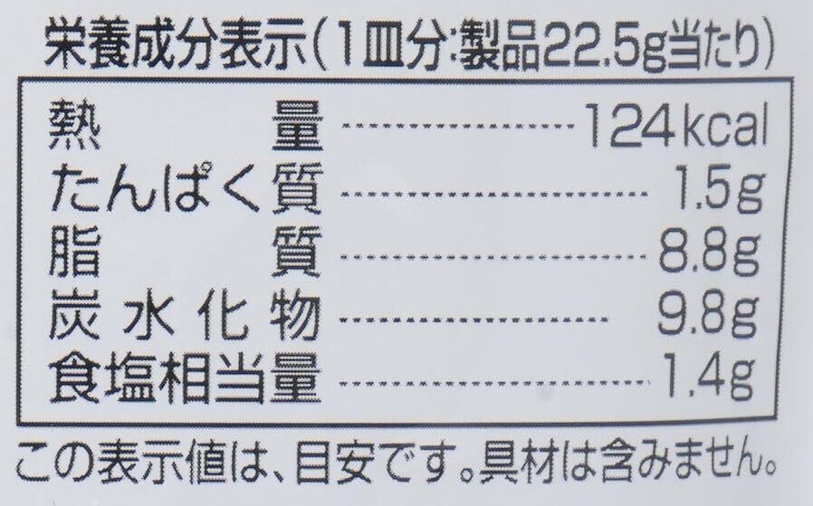 1食(22.5g)あたり:118kcal、たんぱく質 0.9g、脂質 7.7g、炭水化物 11.3g、ナトリウム 662mg、食塩相当量1.7g