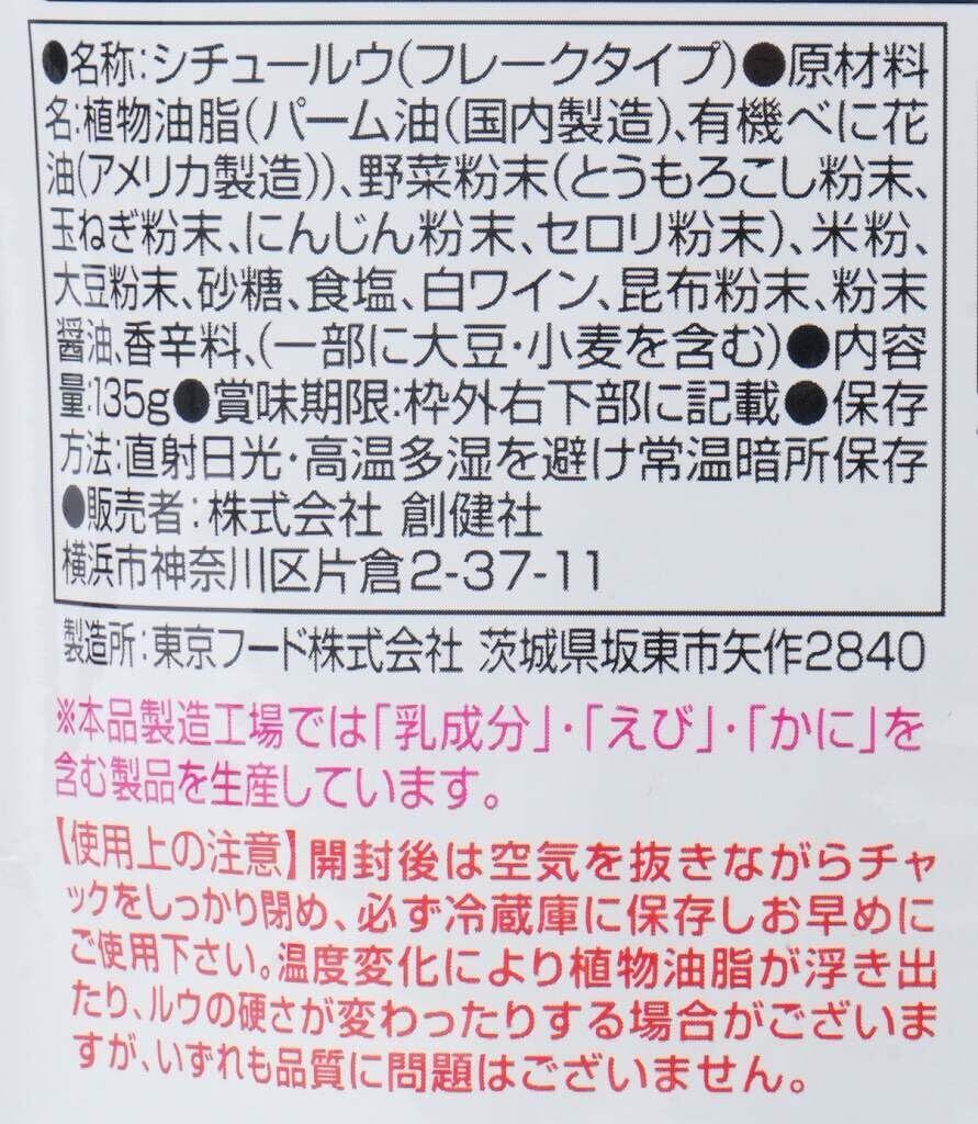 植物油脂(パーム油、有機べに花油)、野菜粉末(とうもろこし、玉ねぎ、にんじん、セロリ)、米粉、大豆粉末、砂糖(喜界島粗糖)、食塩(天日塩)、白ワイン、昆布粉末、粉末醤油、香辛料(ホワイトペッパー)、(一部に大豆・小麦を含む)※小麦は「粉末醤油」の醤油の原料の小麦です。