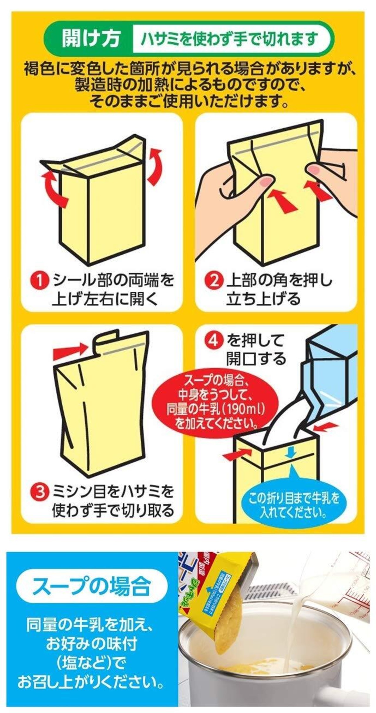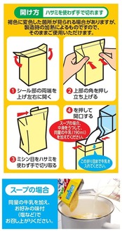 スープの場合、同量の牛乳を加え、お好みの味付(塩など)でお召し上がりください。その他、シチューやパスタ、コロッケなど様々なお料理にもご使用頂けます。