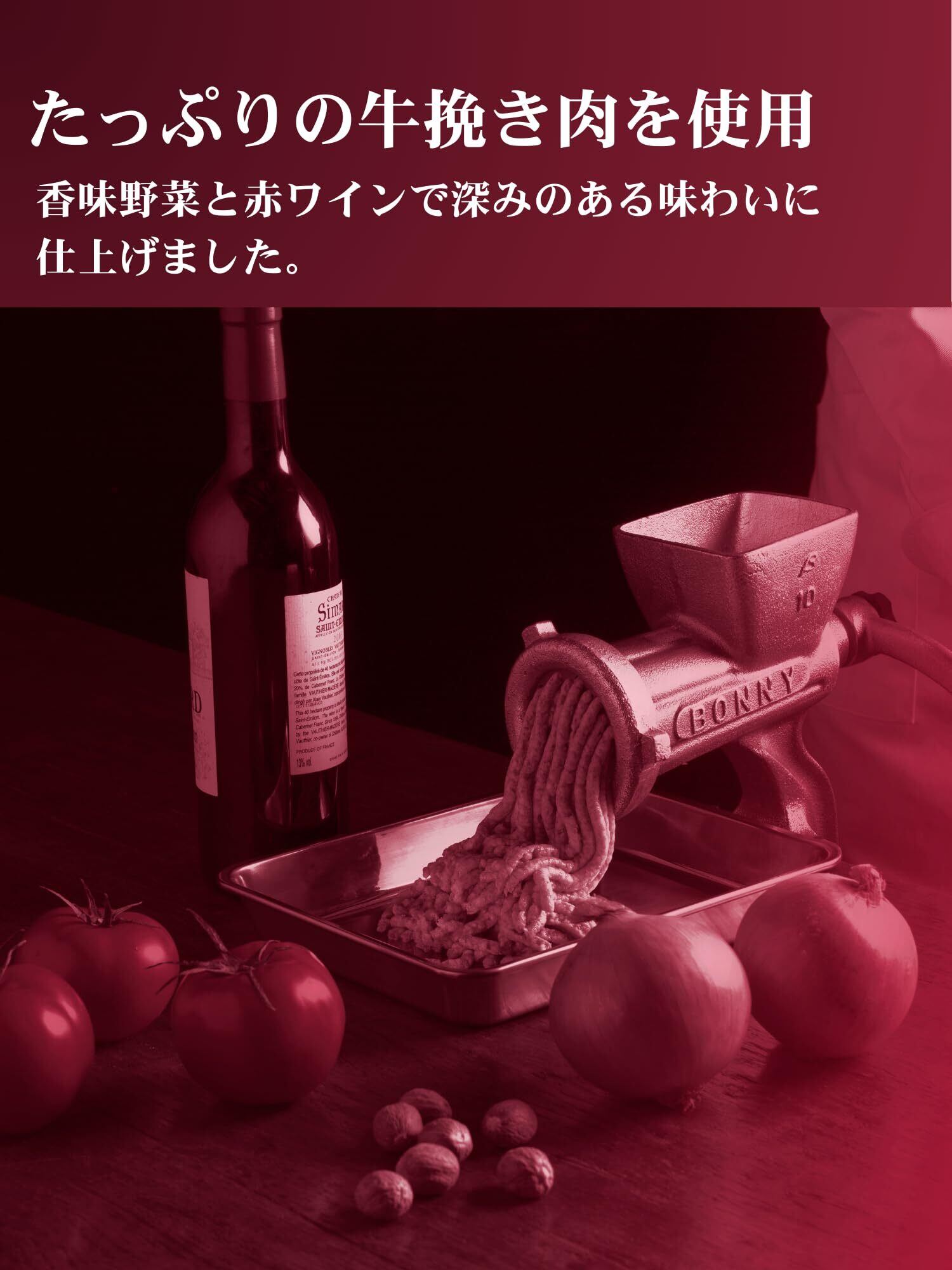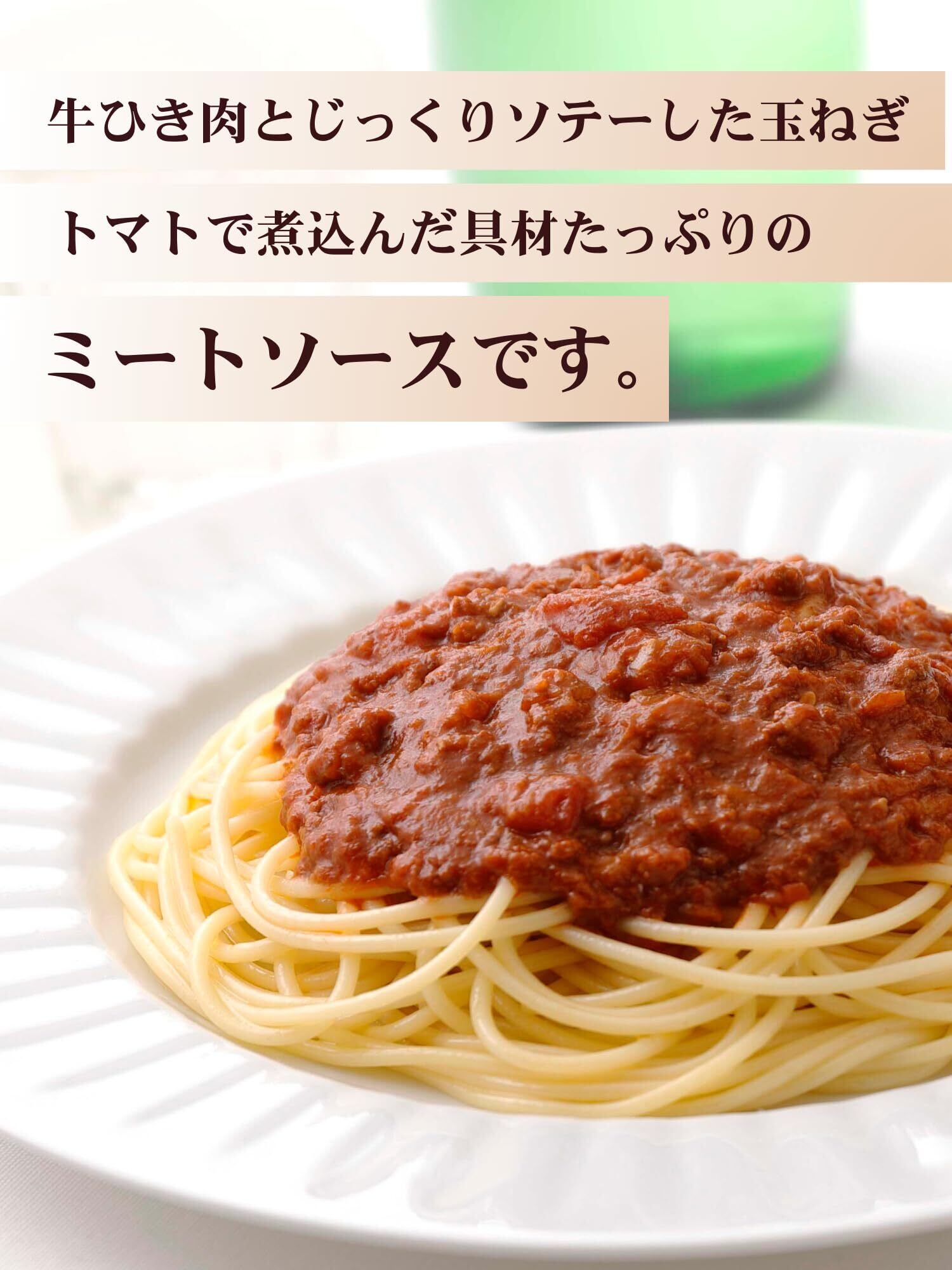 【ミートソース】【たっぷりの牛挽き肉】挽き肉は牛のみを使用しています。パスタからこぼれんばかりの挽き肉の具材感とソースに溶け出した旨みをお楽しみください。【こだわりのべースソース】たっぷりのたまねぎをじっくりとソテーし、旨みと甘みを引き出しています。トマトペーストとダイストマトの2種類のトマトを使用することで、たまねぎの自然な甘みにトマトのさわやかな酸味をきかせたベースソースに仕上げています。【赤ワインを加えた複雑な味わい】赤ワインの酸味や香りが加わることで、牛挽き肉の旨みやベースソースの美味しさを引き立てています。香辛料と合わさることで、複雑で懐かしい味わいを残しています。