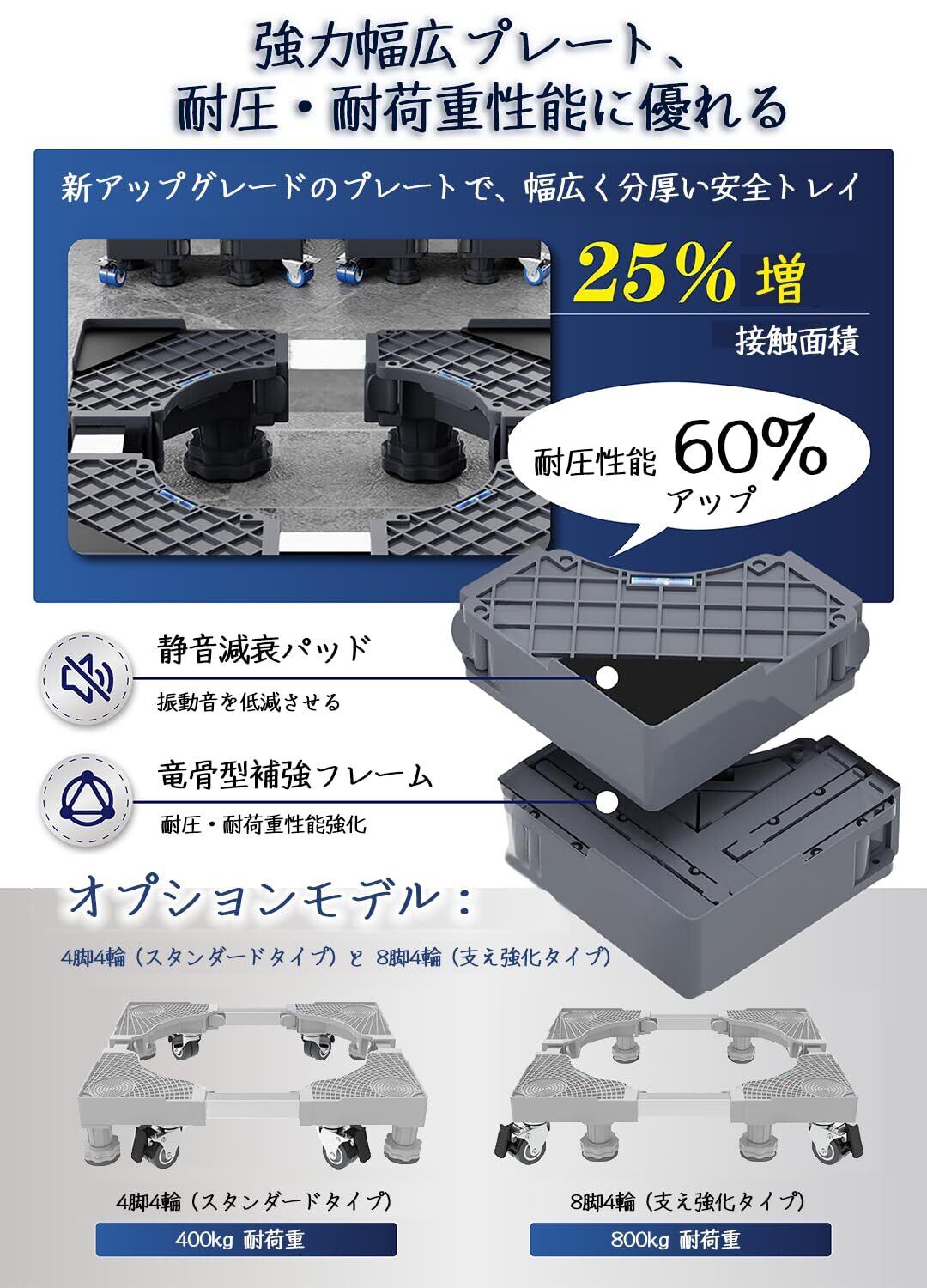 【耐荷重800kg、騒音・振動の低減】 黒い防振パッドがあり、滑りを防ぎ、脱水時のノイズを最小限に抑え、振動を吸収します。また、滑りを防ぎ、洗濯機本体を安定させることで、スムーズで静かな作動を実現します。同じ規格の製品の耐荷重能力をはるかに超えています、耐荷重も800kgまで達します。より多くの家電製品が対応できます!幅広いサイズの洗濯機にもお使いいただけます。