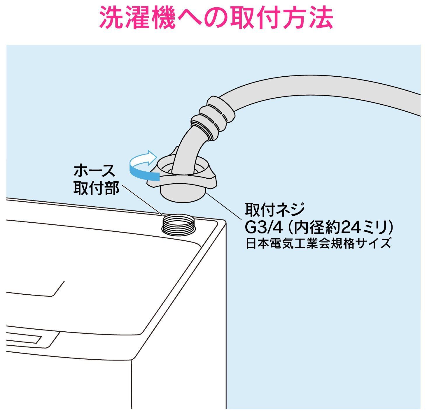 既存の洗濯機用水栓・洗濯機ニップルなどで接続する口金無しタイプです。