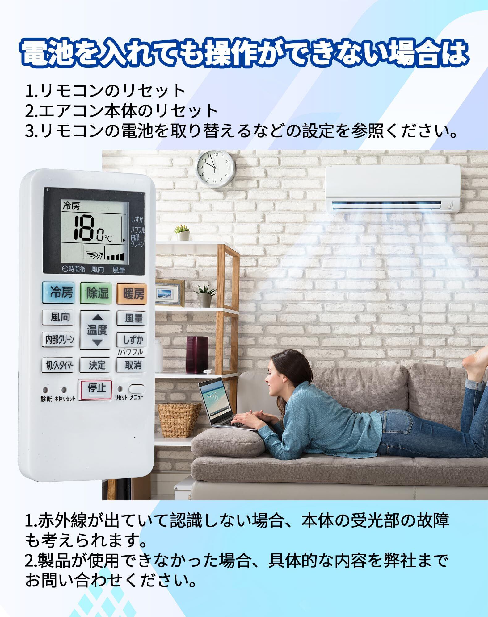 【長距離・広範囲で使用可能】エアコンリモコン パナソニックは強力な広角赤外線を搭載し、操作距離は約8メートル、左右の制御可能角度は約120度です。 距離や角度に制限されず、部屋の隅々からでも簡単に操作できます。【アフターサービス】モコンが正しく作動しないのは、エアコンの設定に関係していることがほとんどですので、リモコンとエアコンの問題が発生した時、にメールより連絡してください。