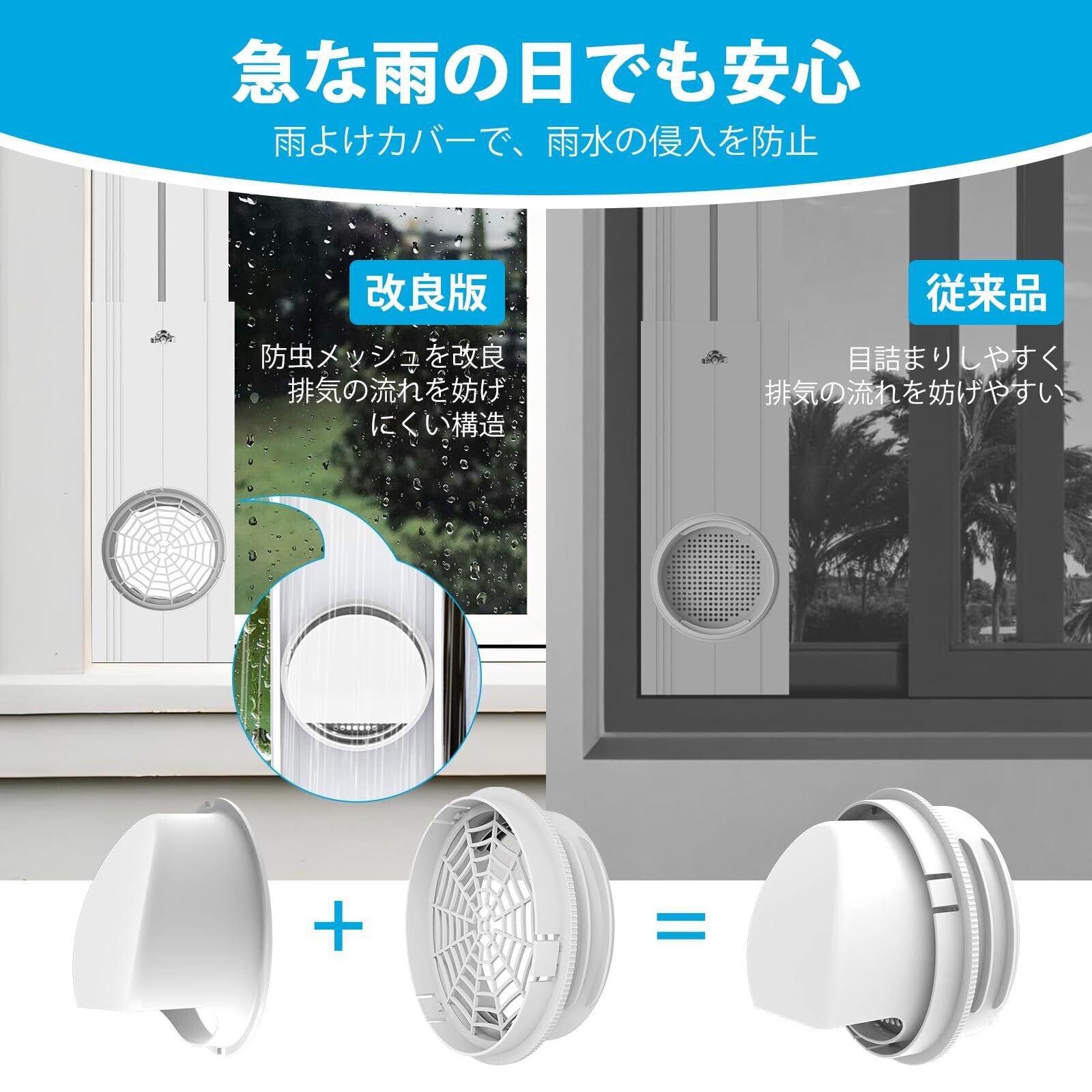 雨よけアクセサリー付きで安心・通気性も向上:雨の日も安心! 当社のダクトパネルには雨よけアクセサリーが標準装備。雨水が排気ホースを通じて機器内部に逆流するのを防ぎ、移動式エアコンを守ります。さらに、ガードネットは、目詰まりしにくい「スパイダーウェブ構造」へ進化。虫やゴミの侵入を防ぎながら、排気を妨げにくく、快適にご使用いただけます。