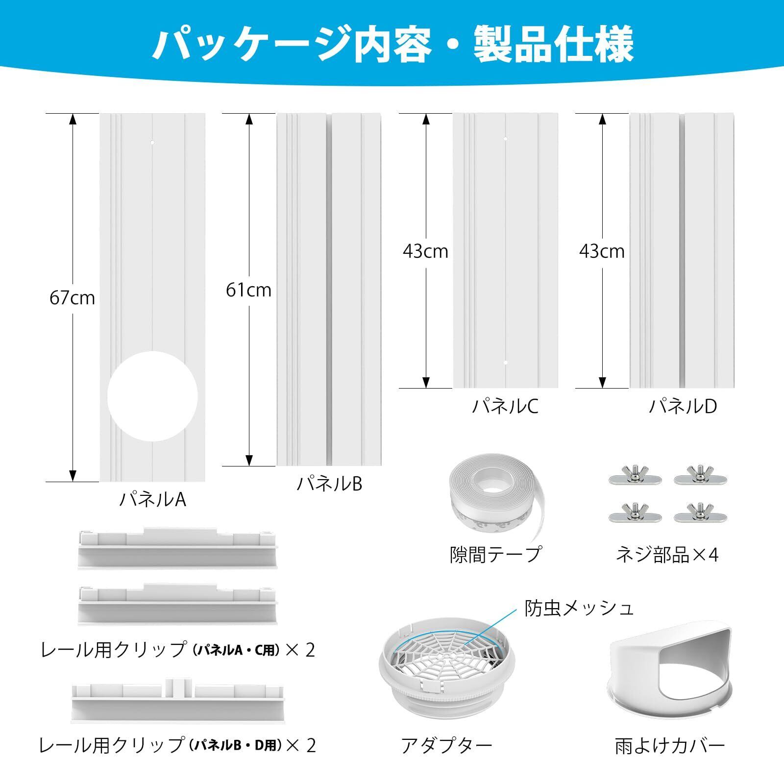 窓用ダクトパネル 4枚セット 高さ67-195cmまで無段階調節可能 移動式エアコン/スポットクーラー用窓パネル 引き違い窓・上げ下げ窓・テラス窓用 賃貸OK 工具不要 簡単設置 隙間なし 雨よけ レール用クリップ付き 13cm/15cmホース兼用