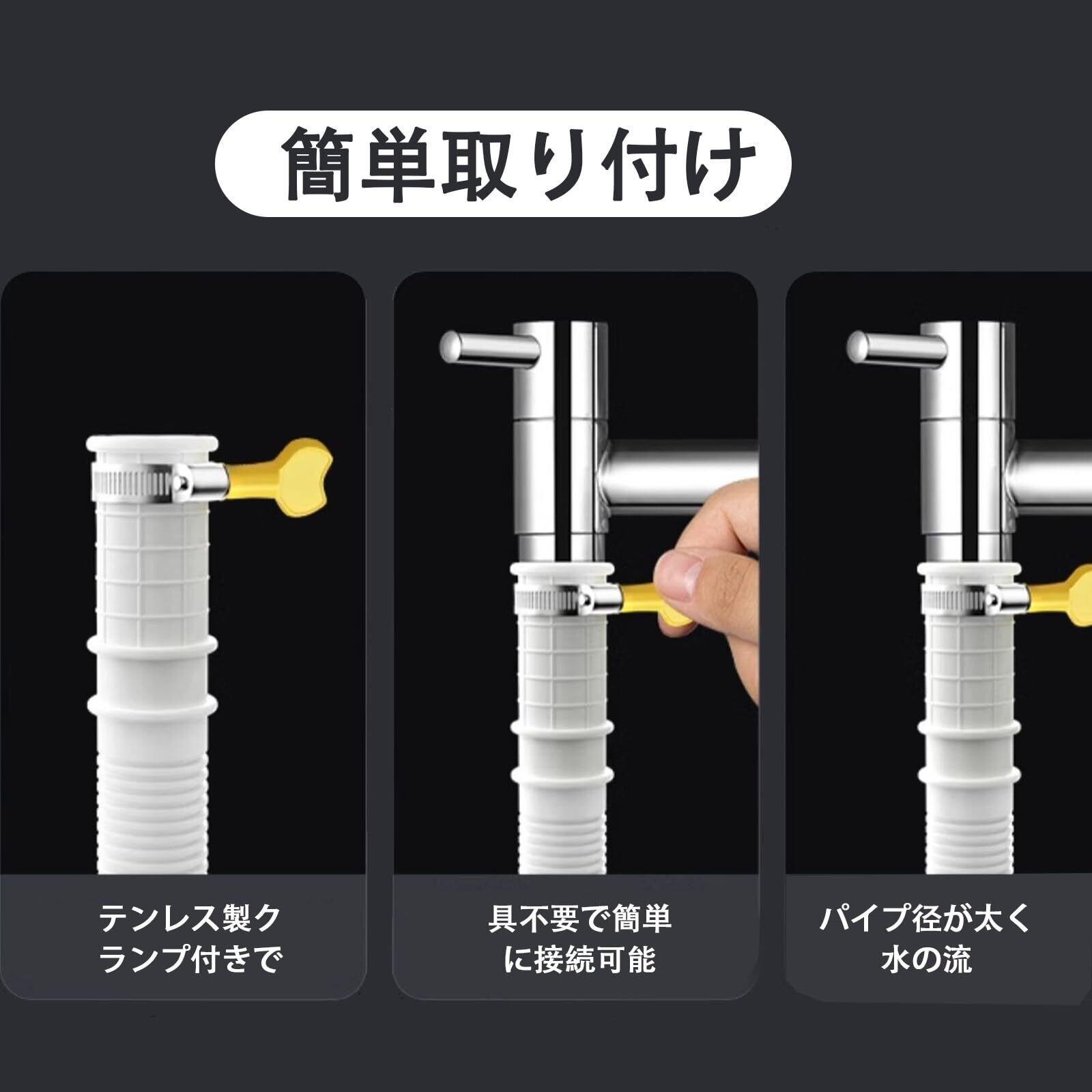 【簡単取り付け】ステンレス製クランプ付きで、工具不要で簡単に接続可能。パイプ径が太く、水の流れもスムーズになります。