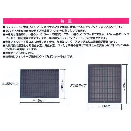●【商品説明】●「レンジフードフィルター キャップタイプ」は、キャップタイプのフィルターです。●レンジフードの金属フィルターにかぶせるだけで簡単に装着でき、油汚れをしっかり受け止め、レンジフードの汚れを防止します。●30cm*40cmまでの金属フィルターに取り付け可能で、一般的な深型60cm・75cm幅のレンジフードで2回、90cm幅のレンジフードで1回分使用できます。●金属フィルター1枚ごとに装着しますので、たるみにくく、スッキリとした装着感が得られます。●塩化水素、臭化水素、フッ化水素等の有毒ガスをほとんど発生しない非ハロゲン系のフィルターを使用しており、装着時に破れにくい角ポケット付きです。●整流板タイプのレンジフードにもお使いいただけます。●【用途】●レンジフードに取り付けることで、少しづつ積み重なる油汚れをしっかり受け止め、レンジフードの汚れを防止します。●【使用方法】●金属フィルターを取り外し、汚れている場合は台所用中性洗剤でこびりついた油汚れをしっかりと除去・水洗いし、乾いた布で水気を拭き取り、裏面に付属の脱着テープを貼ります。
