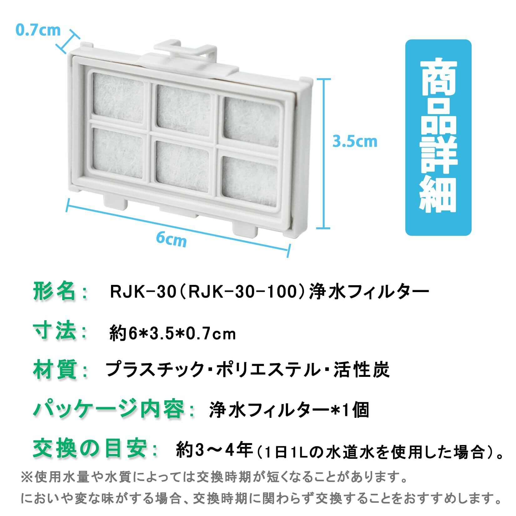 【浄水フィルター・1個入】形名:RJK-30( RJK-30-100 ) 浄水フィルター 。材質:プラスチック・ポリエステル・活性炭。機能:水道水をろ過して水中に含まれる不純物を除去することができます。
