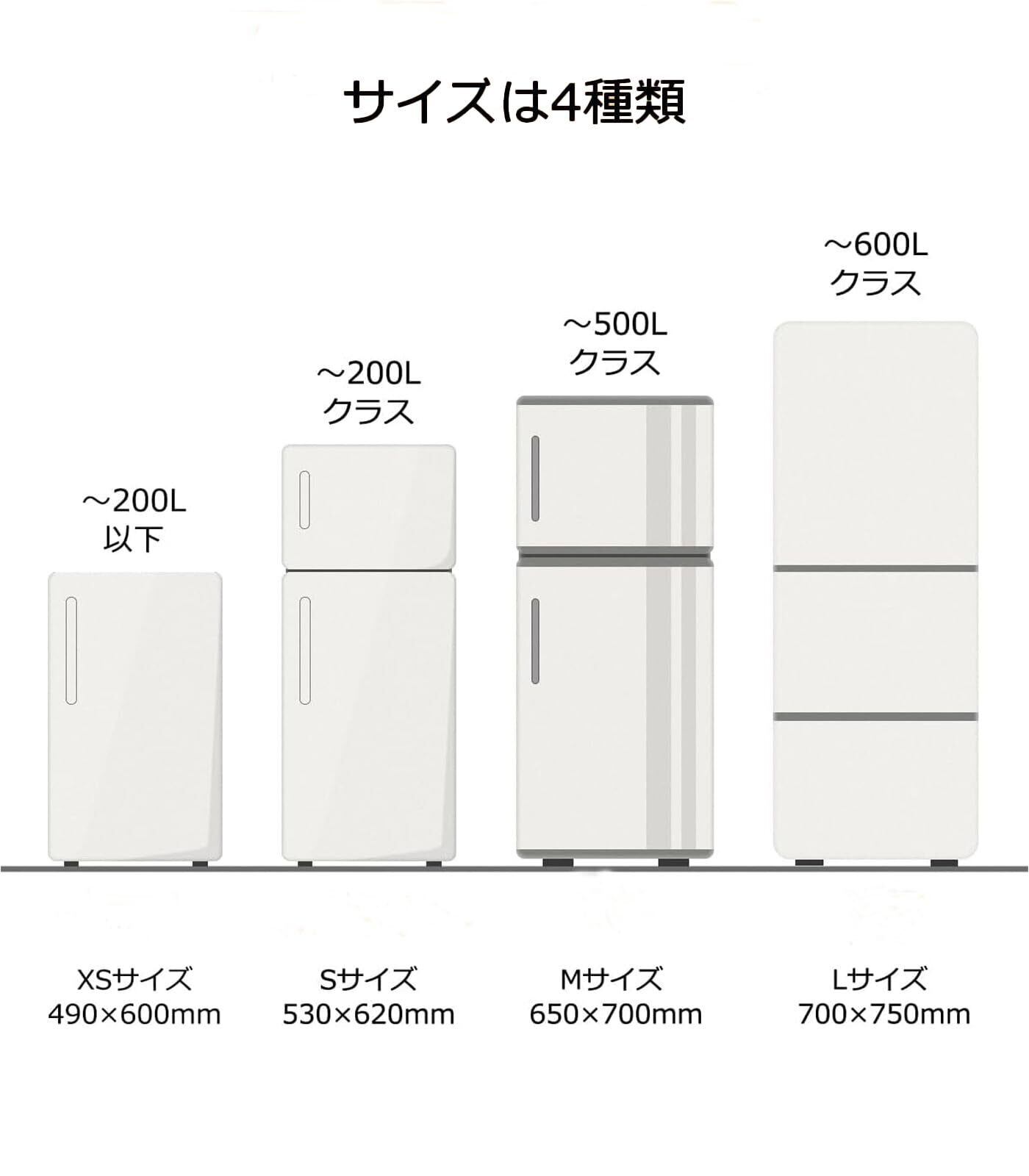 【注意事項】この冷蔵庫マットは4つのサイズがありますので、必ずご自身の冷蔵庫サイズを確認のうえお選びください。サイズの種類:XSサイズ49×60cm(200Lクラス以下の小型冷蔵庫対応)、Sサイズ53×62cm(200Lクラスの冷蔵庫対応)、Mサイズ65×70cm(500Lクラスの冷蔵庫対応)、Lサイズ70×75cm(最大600Lクラスの冷蔵庫対応)。