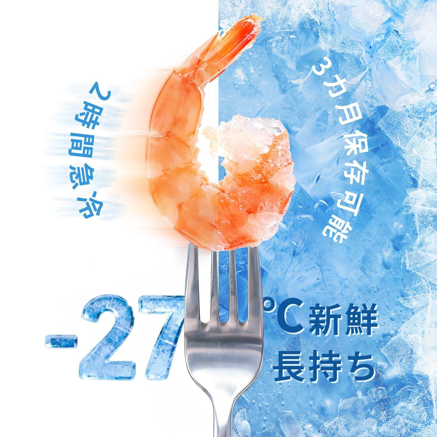 【4段階温度調整&急速冷凍】 4段階の温度調整が可能で、2時間で急速冷凍ができます。3D冷風循環システムを搭載し、庫内全体を均一に冷却。肉や魚などの細胞破壊を防ぎ、風味や栄養素の損失を最小限に抑えます。冷凍後も鮮やかな色合いと美味しさを保つ優れた性能を提供します。