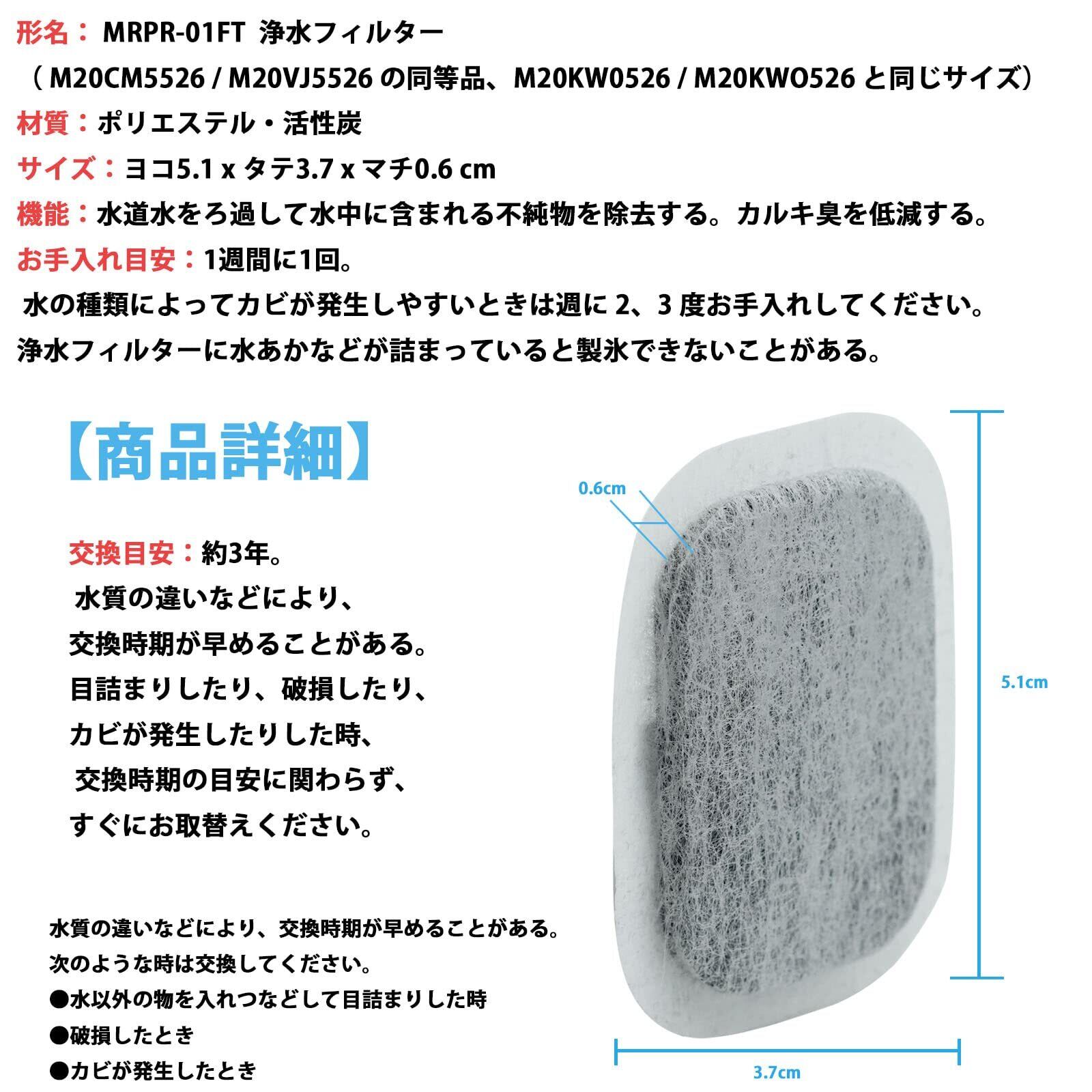 【形名】 MRPR-01FT 浄水フィルター ( M20CM5526 / M20VJ5526 の同等品、M20KW0526 / M20KWO526 と同じサイズ)。材質:ポリエステル・活性炭。 機能:水道水をろ過して水中に含まれる不純物を除去する。カルキ臭を低減する。