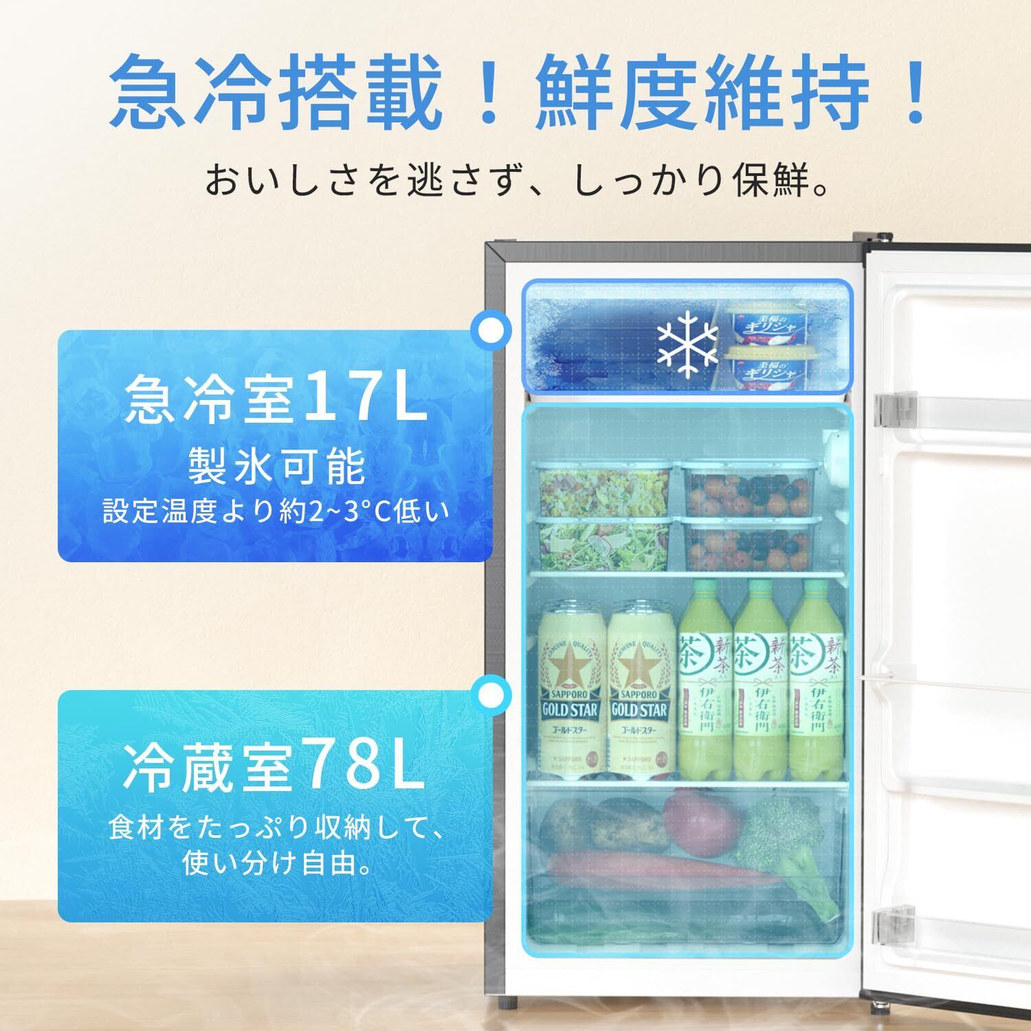 【95Lのたっぷり収納で一人暮らしに最適】冷蔵容量はたっぷり95L。飲料や野菜、作り置きのおかずなどをまとめて保存でき、一人暮らしの方や学生、単身赴任の方にぴったりです。サブ冷蔵庫としても活躍し、メインの冷蔵庫に入りきらない分もスマートに補完できます。