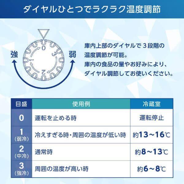 ダイヤルひとつでラクラク温度調節 庫内上部のダイヤルで3段階の温度調節が可能。 庫内の食品の量やお好みにより、ダイヤル調節してお使いください。