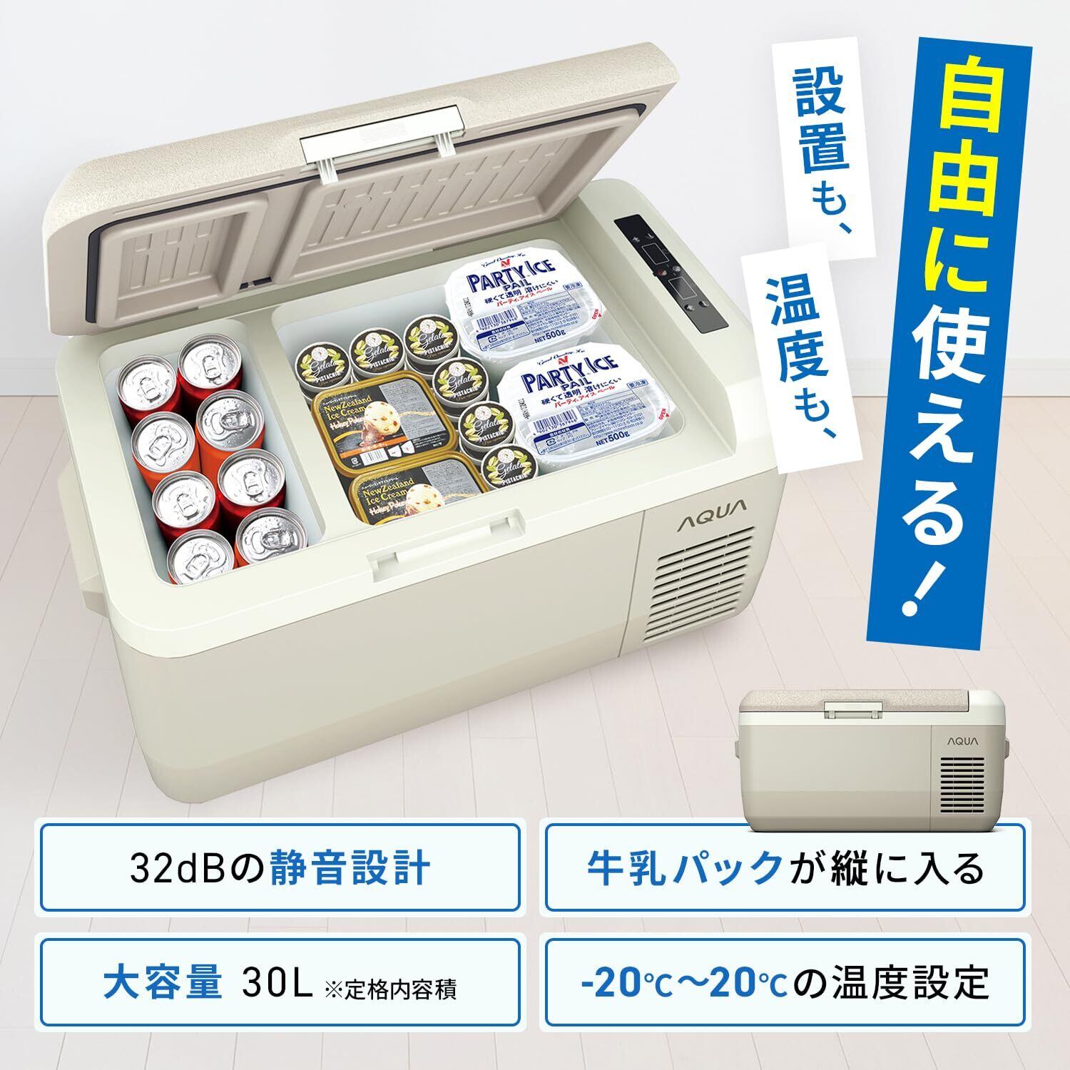 アクア(AQUA) 冷蔵庫 小型冷蔵庫 ポータブル冷蔵庫 30L 一人暮らし ミニ冷蔵庫 冷凍庫 -20℃~20℃温度調節 車載家庭両用 コンプレッサー式 静音設計 2WAY電源対応 DC12V/24V/AC100V 2つの収納スペース 買い溜め 冷凍食品保存 キャンプ アウトドア 寝室 オフィス スリム設計 省エネ AQP-M3R グレージュ