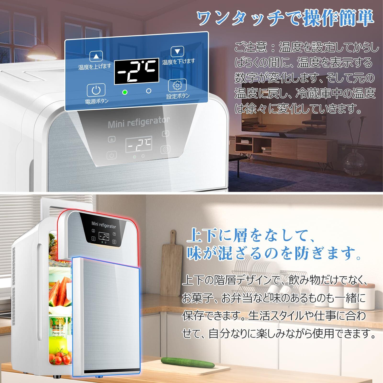 【22L大容量の収納力】庫内容量は22Lで、飲み物だけでなく、おしぼりの冷却や化粧品、お菓子、調味料などの冷やし保存ができるほどの収納力です。取り外し可能な仕切り板(1枚)を使って、飲み物などに合わせてスペースを調節できて使い勝手にも優れています。上下に層をなして、味が混ざるのを防ぎます。容量の目安:250ml缶(縦置または横置)×15本、550mlペットボトル(横置)×6本、(数量は、入れ方、各メーカーの容器の形状、中に入れるものなどよって変わります。)