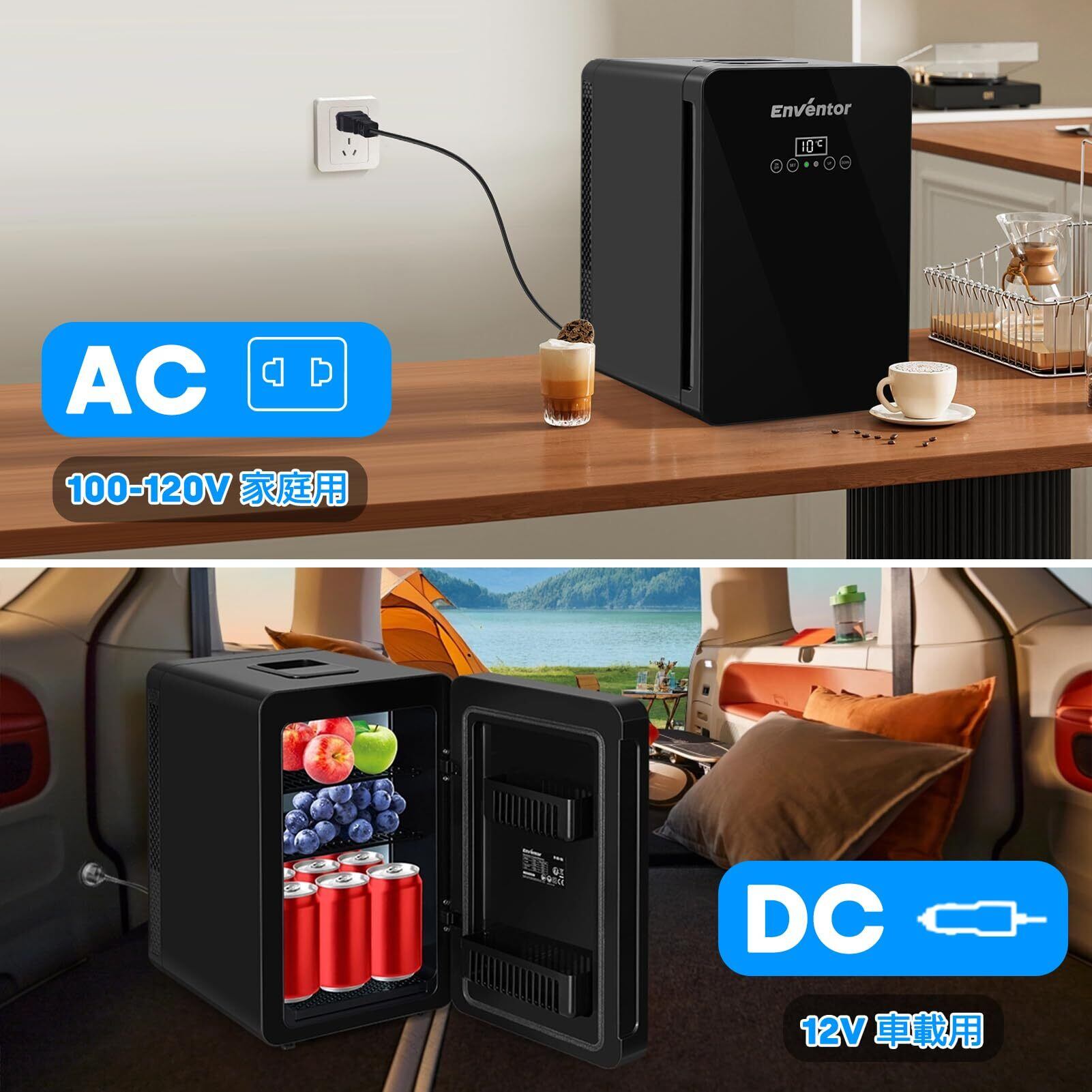 Enventor 冷温庫 15L 小型 保冷・保温用 冷蔵庫 極静音 LCD温度表示 ワンタッチ操作 PSE認証 温度調節可能 ミニ冷蔵庫 車載 冷蔵 保温 一人暮らし 持ち運び便利 12V 車中泊 キャンプ アウトドア 職場 卓上 寝室 家庭用 省エネ AC/DC給電(ブラック)