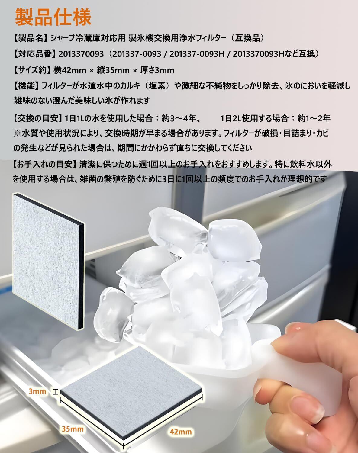 【対応型番】本製品はシャープ製冷蔵庫の製氷機に対応した交換用浄水フィルターです。対応型番:2013370093(2013370093H)/ 201337-0093 / 201337-0093H / 201 337 0093など。純品と同等の性能を持つ互換フィルターとして安心してご使用いただけます。【材質】コットン+活性炭フィルター構造 【サイズ】35×42×3mm 【主な機能】活性炭フィルターが水道水中のカルキ(塩素)や微細な不純物をしっかり除去、氷のにおいを軽減し、雑味のない澄んだ美味しい氷が作れます。