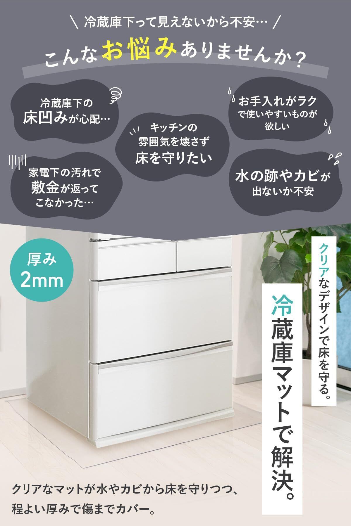 【透明クリアで目立たないデザイン】 インテリアの雰囲気を損なわないクリアマット。透明タイプだから設置しても目立たず、どんな部屋にも馴染みます。冷蔵庫の下だけでなく、キッチンやダイニングに違和感なく使用可能なクリアマットです。