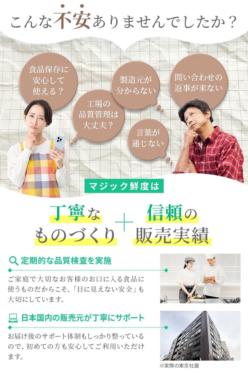 【品質へのこだわりと二重梱包】「マジック鮮度」では、厳格な品質試験を実施しています。JIS規格(日本産業規格)に準拠した8つの品質試験を、国内の検査機関で検査・評価。高い安全基準をクリアした製品のみをお届けしています。さらに、BPAフリー(BPAを含まない)素材を採用して気兼ねなくお使いいただけるよう、細部までこだわり抜いています。梱包にも万全を期し、二重包装を採用。商品本体の包装袋に加え、さらに輸送用包装袋でパッキングすることで、配送中の傷や汚れを防ぎ、清潔な状態でお届けします。品質・使いやすさにこだわった「マジック鮮度」をお届けさせていただきます。