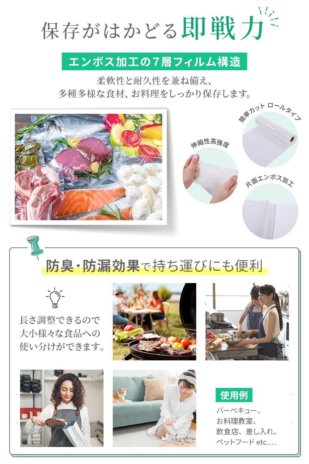 【真空パックの手順】1,片側をシールし、袋状にして食品を入れます。2,エンボス加工面を下にしてセットすると、空気が抜けやすくなります。3,シール部分に皺や隙間があると、空気漏れの原因になるため、しっかり密着させてください。4,中身を入れすぎると空気漏れの原因になりますのでご注意ください。※補足※真空パック機のシール部分から最低2.5cm以上、厚みがある場合は5cm以上離して中身をいれてください。厚みがある場合は、より幅をもってパックしてください。袋いっぱいに詰めて行うと、シール部分に細かいシワが付き、真空エラーの原因となります。※カラー写真付き日本語説明書も付属していますので、ご使用方法はお写真でのご確認もいただけます。