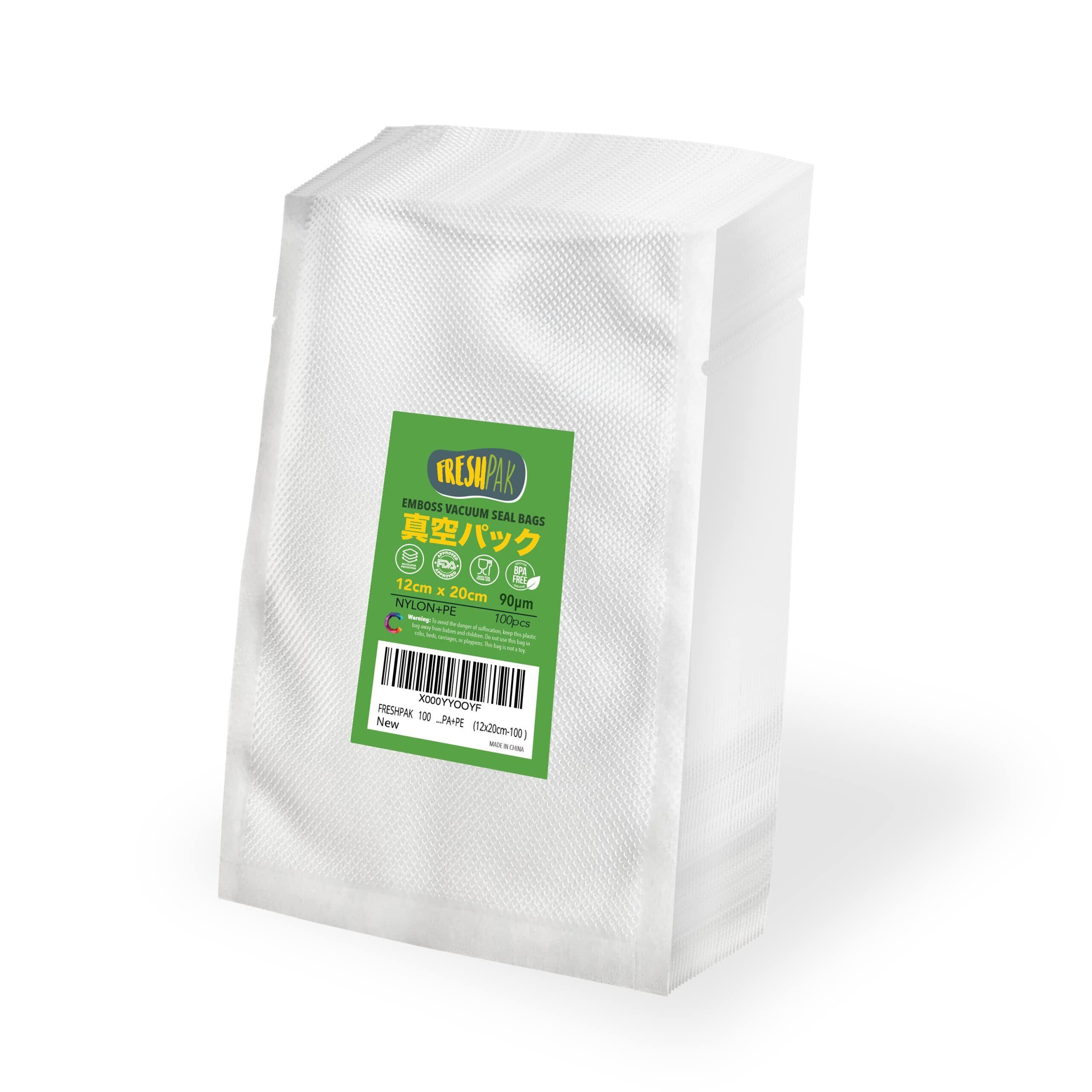 真空パック 袋 FRESHPAK エンボス加工 12x20cm (4.8x7.9”) 90μ 100枚入り ナイロン ダイヤ カット済み 鮮度長持ち 食品保存 電子レンジ解凍 冷凍保存