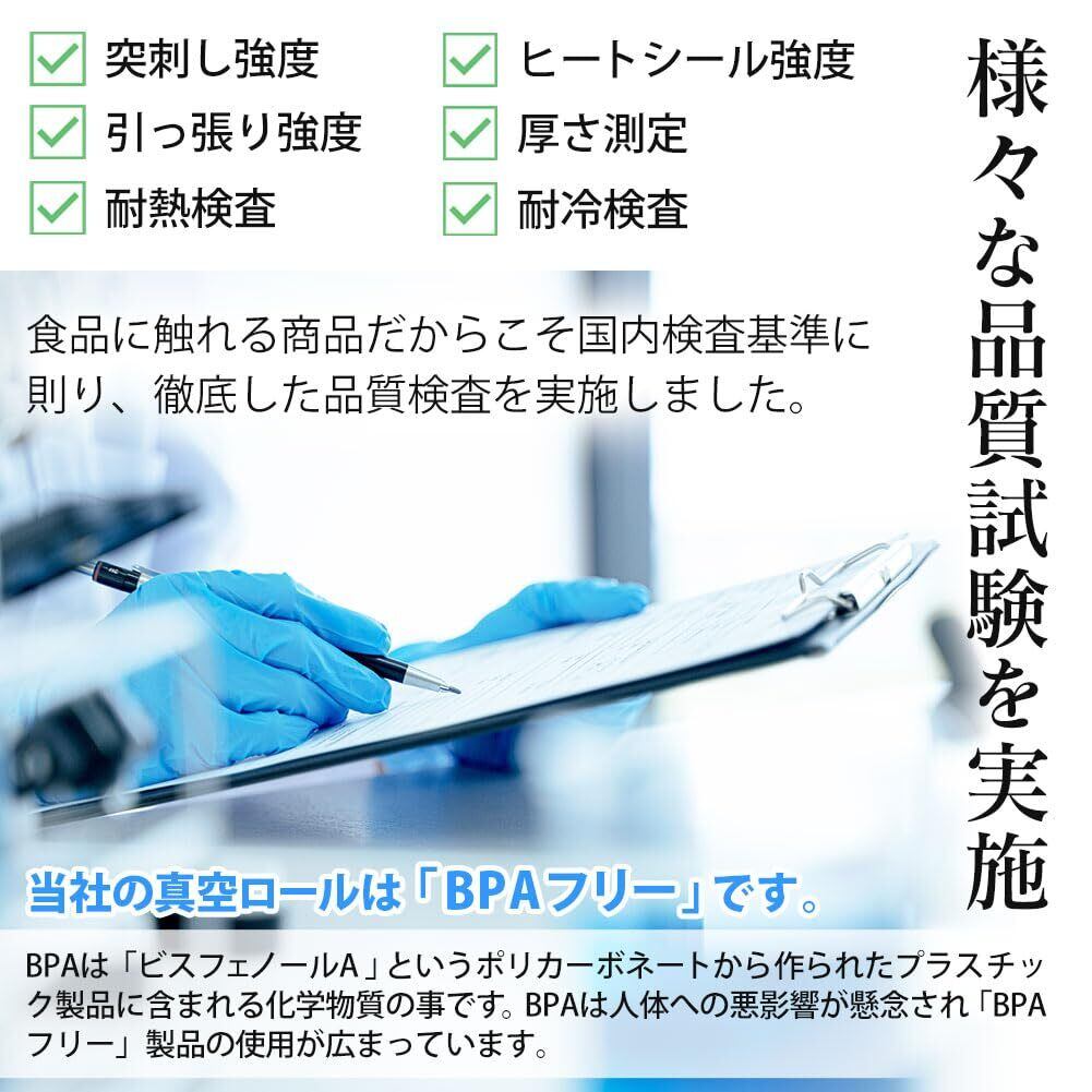 【当社は山口県にある総合通販企業です。安心してお買い物をお楽しみください。】 【お手持ちの各種真空パック機に対応します】 【両面エンボス加工フィルムだから空気や液体を効率よく排出します。】 【電子レンジ解凍OK】【湯煎あたためOK】【冷凍保存OK】【冷蔵保存OK】 【厚さ135μで破れにくく、突き刺しに強い高強度】【様々な品質試験を実施 ■突き刺し強度 ■ヒートシール強度 ■引っ張り強度 ■厚さ測定 ■耐熱検査 ■耐冷検査】 【当社の真空ロールは「BPAフリー」です。BPAは人体への悪影響が懸念されていますが、当社のロールは安心してご利用いただけます。】