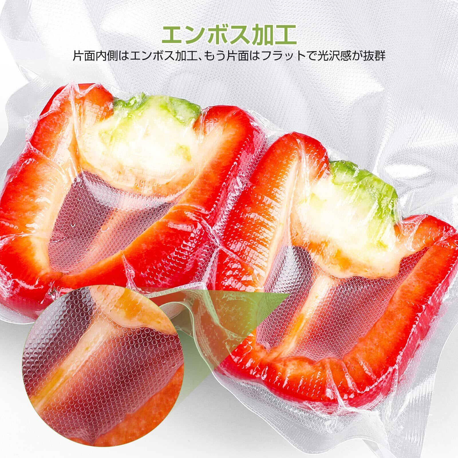【エンボス加工】鮮度保持効果の期待出来る「エンボス加工」を施した真空パック専用袋です。全ての真空パック器に適しています。片面内側は吸引時の空気の流れを最大にするエンボス加工、もう片面はフラットで透明です。しなやかな柔軟性と抜群の透明性・光沢感が抜群、美味しく見えるので、家庭用はもちろん、強度抜群でネット通販や飲食店の一次保存用などにもオススメです。食材を取り出したい時はすぐに開けることができるノッチ付きタイプ、ハサミいらず。