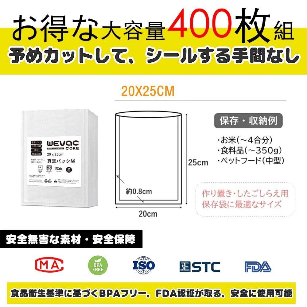 Wevac 真空パック 袋 エンボス加工 20×25cm 業務用大容量400枚 真空袋 カット済み 真空パック機 専用袋 脱気しやい 安全素材 BPAフリー フードシーラー 真空包装袋 抗菌袋 脱気密封 鮮度長持ち 食品保存 家庭用