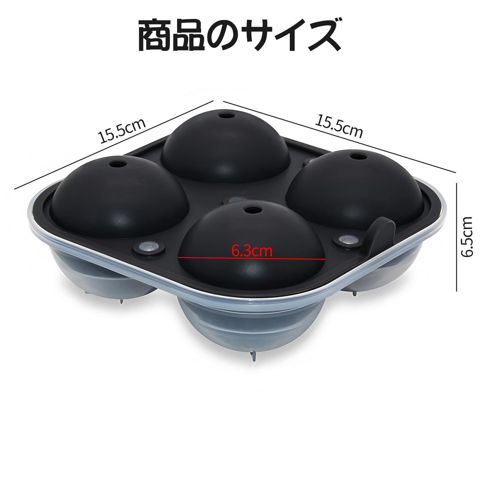 丸い氷 製氷皿 製氷器 アイスボールメーカー シリコン 4穴 直径約6.3cm 漏斗付き 蓋付き冷凍保存 水漏れなし 取り外しが簡単 多用途 氷が作れる ウイスキー カクテル ジュース用 家飲みがより楽しめる (丸型、ブラック)