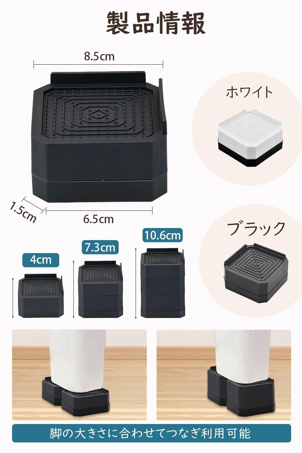 洗濯機用防振かさ上げ台 高さ調節 防振ゴム付き 高さ調整 机 継ぎ脚 ベッド・テーブルの高さ調節 テーブル 脚 騒音軽減 滑り止め 家具に傷防止 耐荷重約2000kg 取り外し可能 自由に組合わせる 1セット4個入り 洗濯機置き台 (ブラック, 10.6cm三段)