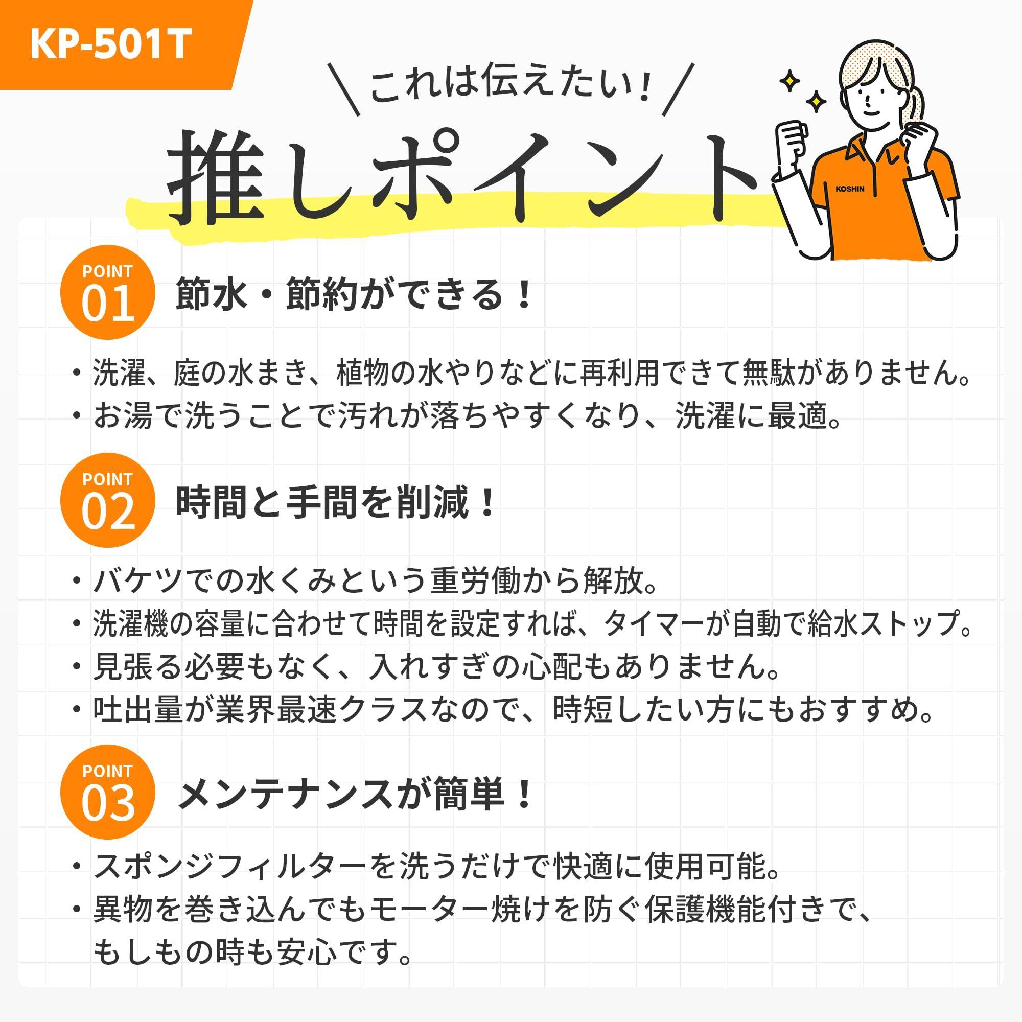 工進(KOSHIN) 家庭用バスポンプ AC-100V KP-501T 15分 タイマー 風呂 残り湯 洗濯機 最大吐出量 23L/分 (3mホース時) 水道 ホース 内径 15mm 使用可能