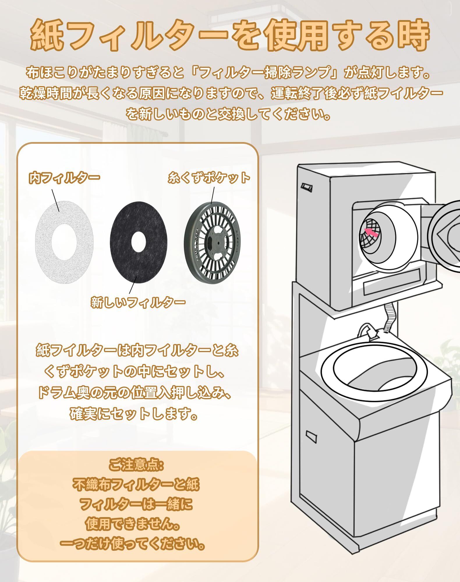 【使用時の注意点】❶「フィルター目詰まり」のランプが点滅した場合、乾燥終了後に必ずお手入れしてください。 ❷紙フィルターを水洗いはしないでください。 ❸フィルターが破れたとか、掃除しても透けて見えなくなったら、新しいフィルターに交換してください。 ❹紙フィルターと不織布フィルターを一緒に使わないでください。