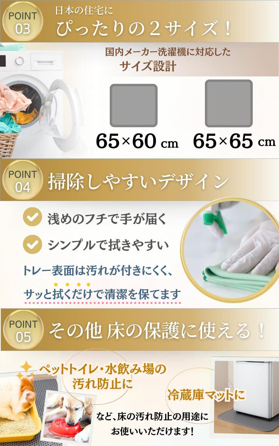 【多用途で家中の床保護に活躍】 洗濯機だけでなく、冷蔵庫下・ペットトイレ・ウォーターサーバー下など、さまざまな場所で水濡れ・汚れ防止に使えます。