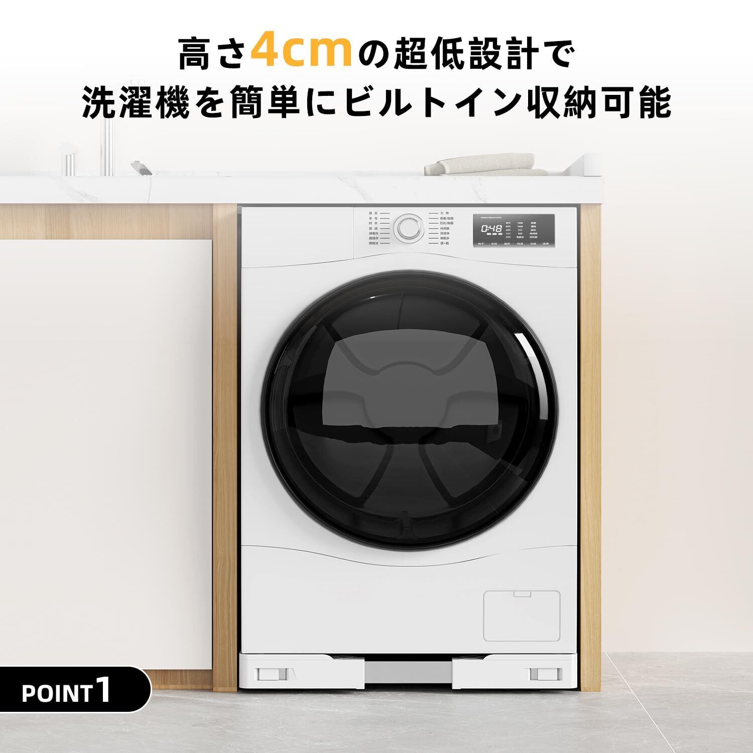 【超薄型設計でどんな環境にも対応】本製品は、わずか4cmの超薄型デザインを採用しており、限られたスペースにもスムーズに設置が可能です。内嵌構造により、洗濯機や乾燥機をセットしても見た目がすっきり整い、インテリアにも馴染みます。また、高品質なステンレス鋼とABS樹脂を使用し、優れた安定性と耐腐食性を実現しました。360度のスムーズな移動が可能で、最大150kgまでの耐荷重性能を誇ります。さらに、洗濯機や冷蔵庫との接触を防ぎ、排水や清掃の問題も簡単に解決します。