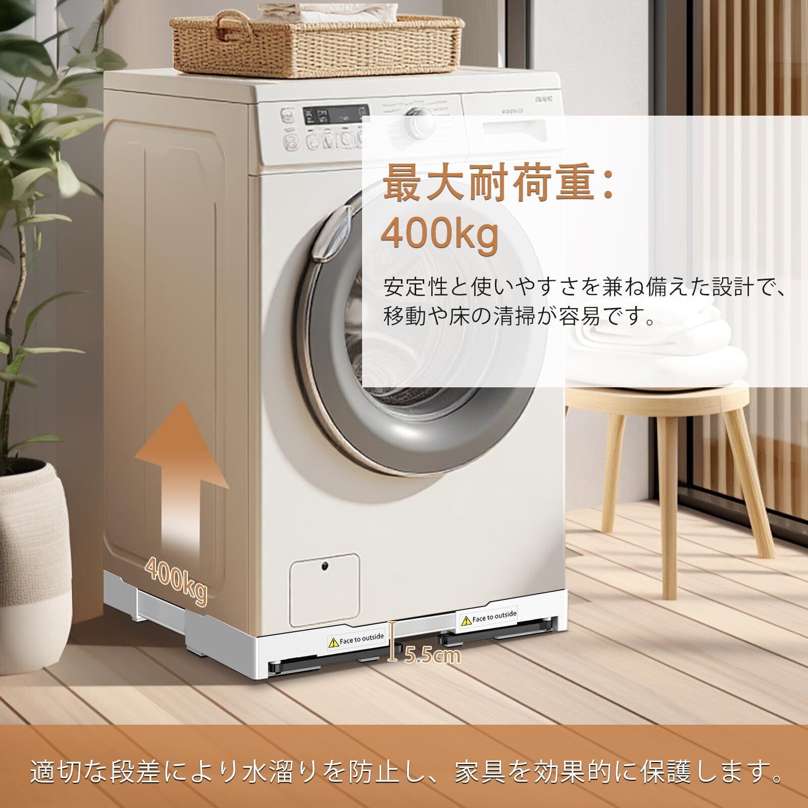 最大400kgの高耐荷重: 産業用グレードのスチール製頑丈構造で、洗濯機や乾燥機、冷蔵庫などの大型家電をしっかり支えます。安定した設置を実現する洗濯機 かさ上げ台として最適です