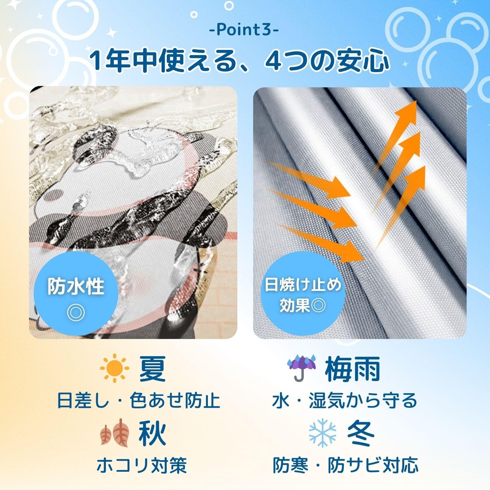 頻繁に開閉する場所だからこそ、ジッパー+マジックテープのダブル設計。サッと開けられてしっかり固定。長時間使ってもへたりにくく、耐久性◎。カバーのずれやゆるみを防ぎ、洗濯機本体をしっかりガードします。