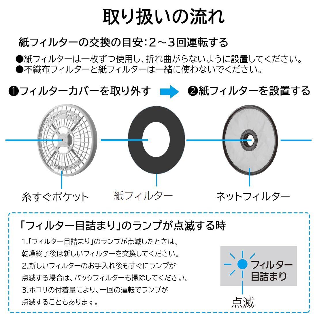 【ご注意】❶「フィルター目詰まり」のランプが点滅した場合、乾燥終了後に必ずお手入れしてください。 ❷紙フィルターを水洗いはしないでください。 ❸フィルターが破れたとか、掃除しても透けて見えなくなったら、新しいフィルターに交換してください。 ❹紙フィルターと不織布フィルターを一緒に使わないでください。